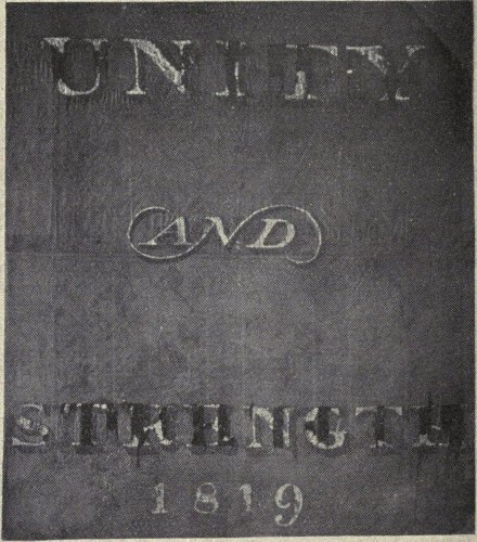 At the entrance to the Reading-room of the Reform Club at Middleton (on the left as you reach the door) may be seen one of the Banners carried at Peterloo by the Middleton contingent, which was led by Samuel Bamford. It is of green material (or so it seemed to me) and the letters are stamped on it in gold capitals. The motto facing the entrance is LIBERTY AND FRATERNITY. On the other side of the Banner (seen from within the room) are the words: UNITY AND STRENGTH. The explanatory inscription reads: “This Banner was carried by the Middleton Reformers, with Samuel Bamford at their head, to Peterloo, and is frequently mentioned in the historical records of that movement.” (See Illustration opposite).