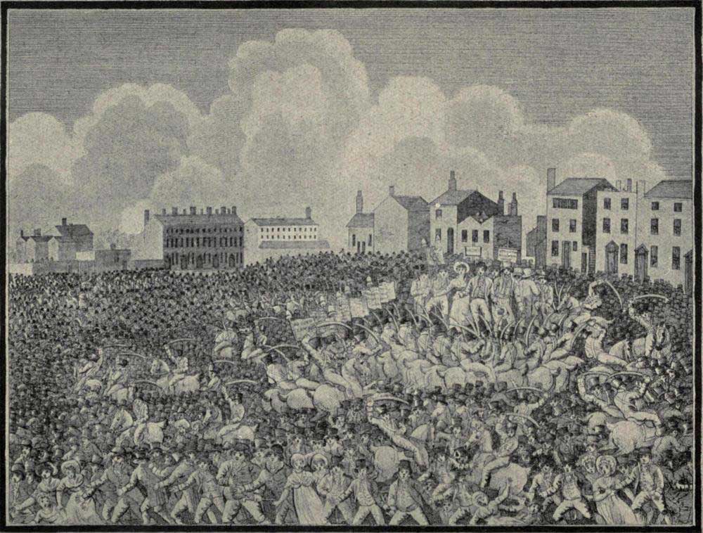 (b) Wroe’s Contemporary Picture of Peterloo, which is shewn on the following page, is perhaps the best of a number of sketches extant. The details are fairly accurate. In the background, on the extreme left, is seen (to quote Bamford) “the corner of a garden wall, round which the Manchester Yeomanry, in blue and white uniform, came trotting, sword in hand, to the front of a row of new houses.” The “corner” is on the site of the north-western corner of the Midland Hotel. The “new houses” were on the site of the present Midland Buffet. Mr. Ewart’s factory, in[Pg 91] the distance, was just off Lower Mosley Street. The row of houses to the right of this, in the background, was on the upper side of Windmill Street. The Hustings are on the site of the south-eastern corner of the Free Trade Hall. Standing on them we may distinguish Mr. Hunt and the Leader of the Manchester Female Reformers. Around them are the Banners of the various contingents; we may even make out the legend “No Corn Laws” on the one in front. The Banner-poles are shaped to resemble caps of Liberty, as shown in another of our illustrations. The crowd are occupying the site of the Free Trade Hall, the Theatre Royal, the Y.M.C.A., the Gaiety, and a number of adjoining buildings.