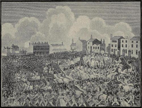 It was the custom in the early decades of the nineteenth century, when newspapers were dear and newspaper files were not available, as there were no free libraries, to collect newspaper cuttings and illustrations, with tracts and “broadsides,” election squibs and so forth, in large scrap-books. Thus, at the Peel Park Library is preserved the scrap-book of Joseph Brotherton (for many years Member for Salford), running to over forty volumes. The Greaves scrap-book at the Reference Library contains a valuable collection of this kind. The Owen collection at the same Library fills over eighty volumes. At the Chetham Library may be seen Lord Ellesmere’s scrap-book and a number of others. From many references to Peterloo in these books we may select the three items which follow: The Greaves collection contains a rare print of Peterloo, somewhat lurid in its detail. Mr. Albert Nicholson has in his possession a highly-coloured copy of this, which he has shown me. No other copies seem to be known.