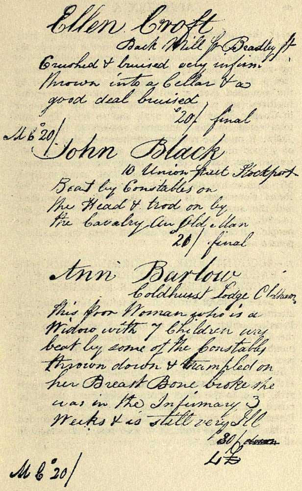 The details given are corroborative of many of the statements in Mr. Bruton’s Story of Peterloo. Thus: the cases include those of Elizabeth Gaunt (mentioned on pp. 274 and 275), of Mrs. Fildes (on p. 274), of Thomas Redford (on pp. 285, 291, and 294). There are references to the loose timber (see pp. 269, 284 and 294), the injuries to Special Constables (see p. 280), the fight near the Friends’ Meeting-house (see pp. 284 and 289), the oak trees growing near that building (see pp. 269, 294), the white hat as a symbol of Radicalism (see p. 273), the fear of losing employment evinced by the wounded (see p. 291), the infantry intercepting fugitives (see p. 290), the child killed by a trooper in Cooper Street (see p. 277), and so on. The sum total voted by this Committee appears to have been £687; it must be remembered, however, that the sum of £3,000 mentioned on p. 291 as having been subscribed may have been used partly for legal expenses.