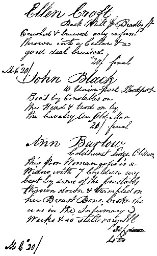 Perhaps it will never be possible to say exactly how many were left dead on the field. One, at anyrate, who died at once, or very shortly afterwards, was (by a strange irony) a Special Constable, and this is probably the “one man killed” of some of the accounts. It will be remembered that Lieut. Jolliffe reported “two women not likely to recover; one man in a dying state; and two or three reputed dead;” in the letter quoted above, describing his visit to the Infirmary on the Sunday following the event.
