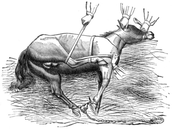 Two modes of restraint are employed in securing the animals during the manipulations for the removal of the testicles, one which is applied to all the various methods yet to be described, and the other applicable principally to the method of amputation of the cord by the use of the écraseur. In the former, the animal is thrown down and secured with one of his hind legs fixed in a position in which the inguinal region is fully exposed. In the latter he is allowed to remain in a standing posture, and is kept quiet by the application of a twitch upon his upper lip. As the first mode of securing the patient is the safest for all parties engaged in the undertaking, and from the further fact of its applicability in all methods of operating, we shall first consider it somewhat in detail.