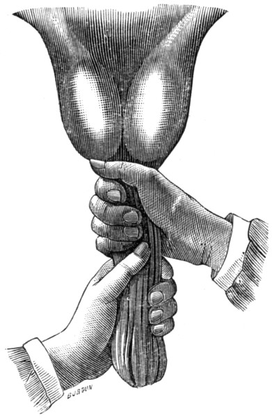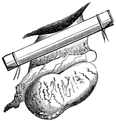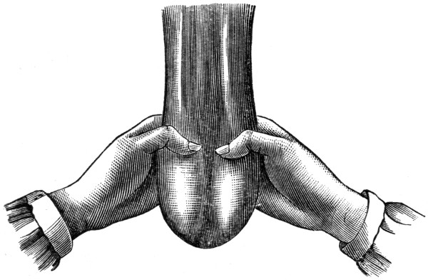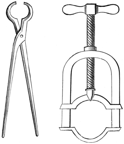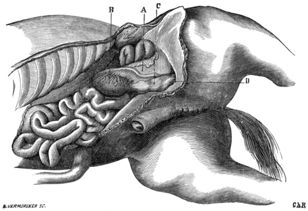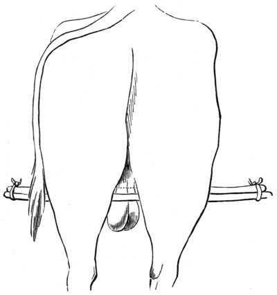 The preparations to which the animal is to be subjected previous to undergoing the operation are the same as those which are required in other cases of surgical manipulation. Some portions of the preparations are, perhaps, of even greater importance, and may not, on any account, be overlooked, when we take into consideration the peculiar position in which the animal must frequently be secured in order effectually to control his movements. Hence, a low diet for twenty-four hours preceding that appointed for the operation, and an empty stomach at the time of castration, with a thorough washing of the sheath, are precautions which no surgeon entitled to the name will overlook or neglect, especially when a soliped[10] is to be subjected to the knife. We shall discuss hereafter the indications in the case of the castration of large females.
