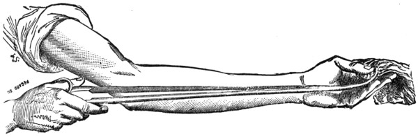 By veterinarians who employ the old method of casting with four hobbles, the animal, being properly prepared, is thrown upon whichever side corresponds with the operator’s habit of manipulation, whether with the right hand or the left, and the leg opposite to that on which he is lying being released from the hobble, is carried forward upon the corresponding shoulder, as far as it can be safely done. To effect this a loop of rope or platelonge is passed around the coronet, below the fetlock, the free end being carried forward over the dorsal border of the neck,[11] under the neck, towards its anterior border, and is then carried back under the same hind leg, between the hinder extremities and over the hock, from the posterior border, where an assistant, stationed at the back of the animal, is ready to receive it (Fig. 1). By careful, gradual and steady pulling upon the rope the foot is brought forward upon the external surface[12] of the shoulder, and there secured by two or three turns of the rope around the coronet.