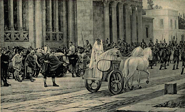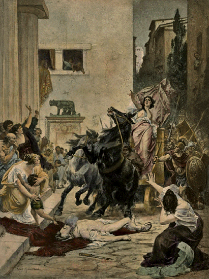 Tullia was the instigator of this coup d'état; and impatient to learn its success, drove to the Forum, and, calling her husband from the Senate chamber, was the first to hail him as king. But Lucius commanded her to return home; and the tradition runs that as she was going thither her chariot wheels passed over the dead body of her royal father.