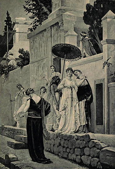 As fair Helen brought woe to Troy, so the abduction of the Sabine maidens was followed by the bitter vengeance of their indignant masculine relatives. If we may believe the old historians, the women soon became reconciled to their enforced condition as wives of the Romans. Doubtless the writers drew this conclusion more from their knowledge of the yielding disposition of feminine nature than from any precise acquaintance with the facts. It being totally uncustomary for the woman to be allowed any decision in the matter, it was a thing of small importance to her whether she was taken by her husband, without either her consent or that of her father, or whether she was given by her father to her husband, equally without being consulted.