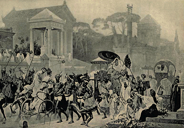 Once more Rome was to have an emperor worthy of the name. The manner in which Severus was received in the city was a good omen for his reign. "At the city's gates," says Dion Cassius, "Severus dismounted from his horse, and laid aside his military dress before entering Rome; but his whole army followed him into the city. It was the most imposing sight I ever saw. Throughout the city were garlands of flowers and laurel wreaths; the houses, adorned with hangings of different colors, were resplendent with the fire of sacrifices and the light of torches. The citizens, clad in white, filled the air with acclamations, and the soldiers advanced in martial order, as if at a triumph. We Senators headed the procession, wearing the insignia of our rank."