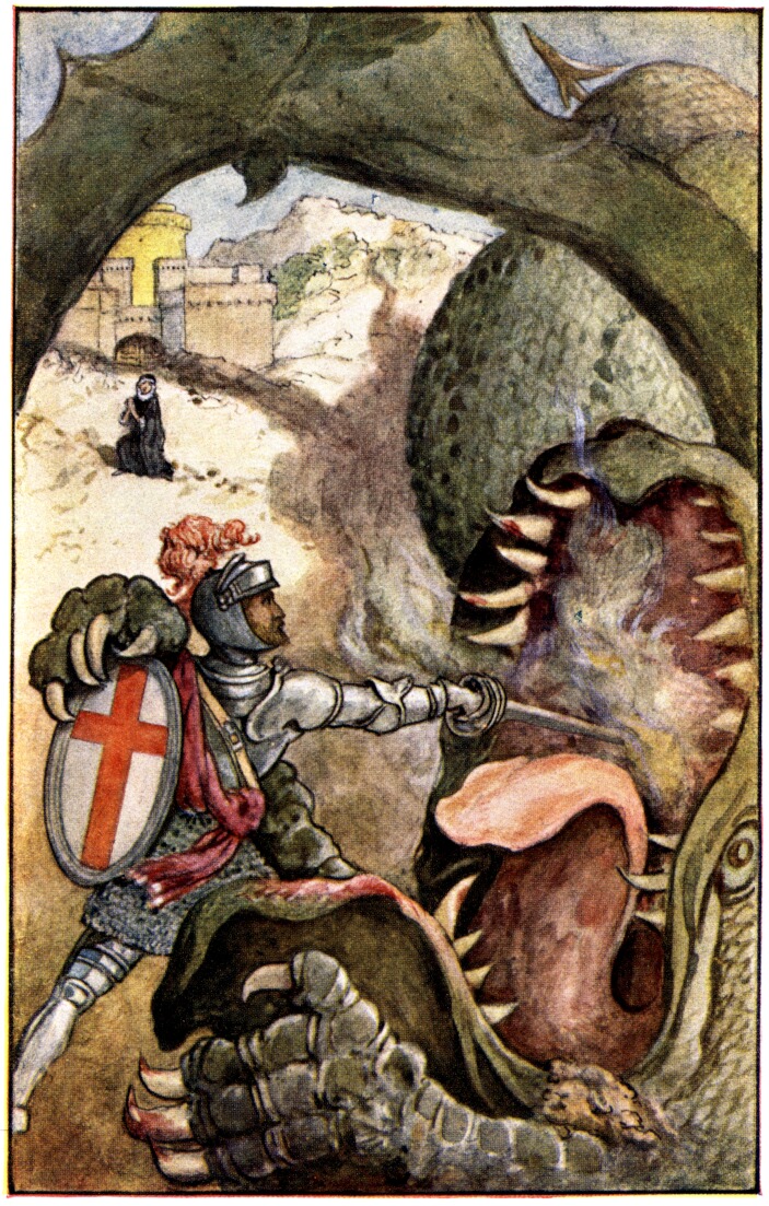 Once upon a time there might have been seen a gentle Knight, riding across the plain. He was clad in armour of proof, and on his arm he carried a silver shield. A shield it was that brave men had carried before him, for there were great dints upon it, which were as a witness of great fights that had been fought. Now the Knight himself had never yet been in battle; but he seemed as one who could bear himself bravely, so well did he sit upon his horse, and so stout of limb he was. On his breast he wore a cross, red as blood, in token that he was vowed to serve the Lord Christ, who had died for him; and on his shield was yet another cross, to be as it were a sign that this service should be a defence to him in all dangers. Somewhat sad of look he was, not as though he had fear in his heart, but rather as one upon whom had been laid the burden of a great task. And such, in truth, there was, for Queen Gloriana had sent him upon a great enterprise, and all his heart was full of the thought of how he should best accomplish it. And the task was this—to slay the Great Dragon.