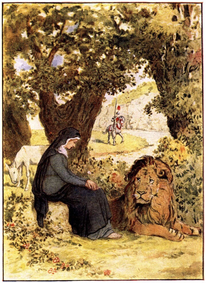 Beside the Knight a lady was riding on an ass as white as snow. Very fair she was; but she hid her fairness under a veil, which was brought low over her face. She was clad also in a garment of black; and she, too, was somewhat sad of look, nor, indeed, without cause. She came of a royal stock, being descended from ancient kings and queens, who had held wide sway in their land until this same Dragon had driven out their ancient house and had cruelly wasted all their realm. The third of this company was a Dwarf, who lagged behind, wearied, it may be, with the weight of the bag in which he bore this fair lady’s gear.