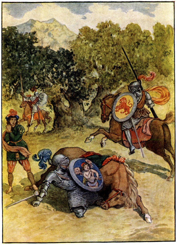 The monster, wakened from her sleep, curled her tail about her head, and rushed to the cavern’s mouth, but, seeing one armed from top to toe in shining mail, would have turned again. But the Knight leaped at her, fierce as a lion leaps upon his prey, and barred her backward way with his sword. First she darted at him her great tail, and threatened him with the deadly sting that lay in it; but he, not one whit dismayed, aimed at her head a mighty blow. Her head it wounded not, but glanced on to the neck with force so great that for a while the great beast was stunned. Then, coming to herself, she raised her body high from the ground, and leaped upon the Knight’s shield, and wrapped his body round with huge folds.