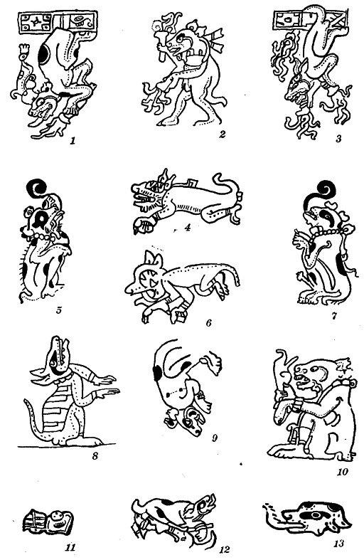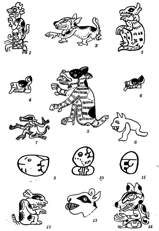 These remains of a once extensive literature show evidence not only of considerable intellectual attainments on the part of their authors but also of a high degree of artistic skill in the drawings and hieroglyphics. The frequent occurrence in these manuscripts of representations of animals showing various degrees of elaboration and conventionalization has led us to undertake the task of identifying these figures as far as possible and studying the uses and significance of the several species, a[284] field practically untouched.284-* Förstemann in his various commentaries on the Maya codices (1902, 1903, 1906), Brinton (1895), and deRosny (1876) have only commented briefly upon this side of the study of the manuscripts. Seler (1904a) and some others have written short papers on special animals. During the preparation of this paper there has appeared a brief account by Stempell (1908) of the animals in the Maya codices. The author has, however, omitted a number of species and, as we believe, misidentified others. In making our identifications we have given the reasons for our determinations in some detail and have stated the characteristics employed to denote the several species.