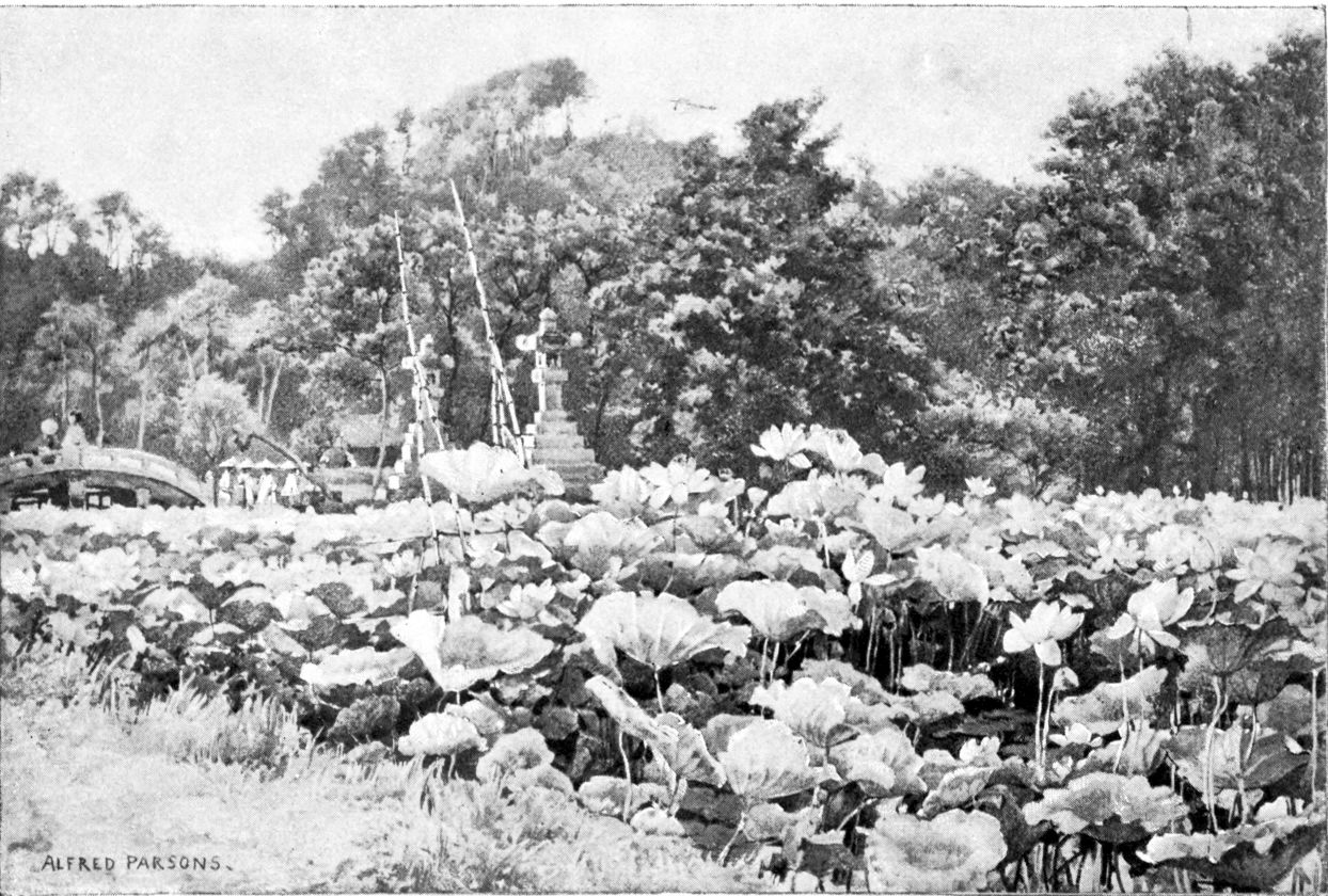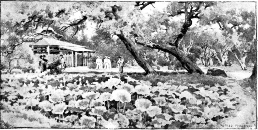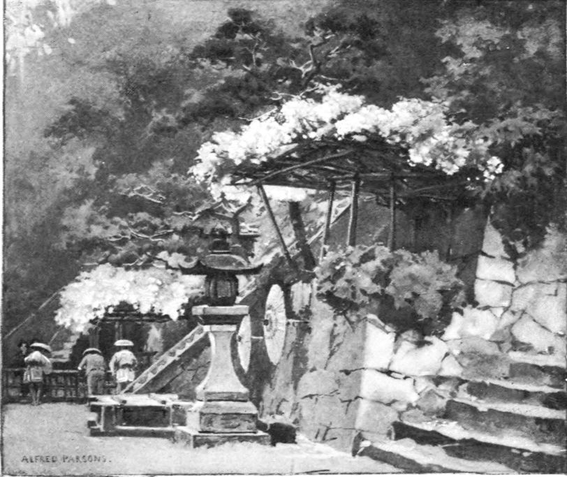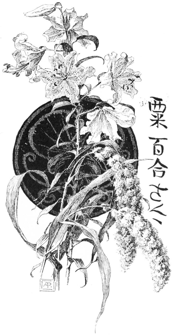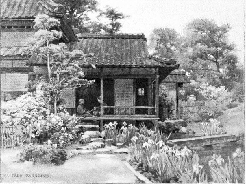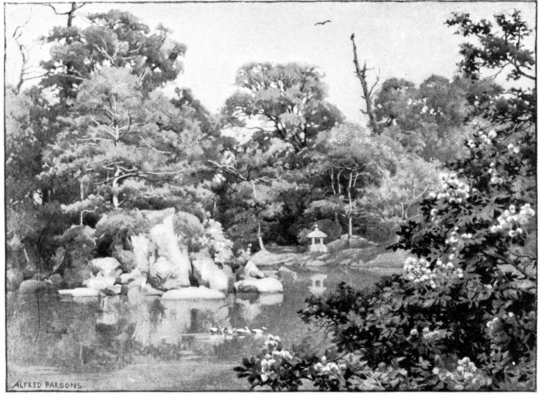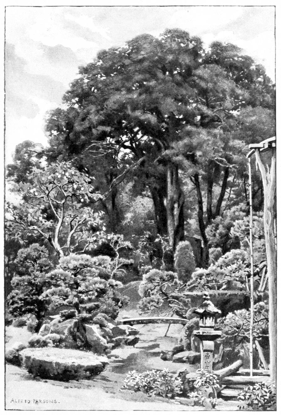grow as they choose, but the others are trimmed into more or less formal shapes, considered suitable to the species, or helping the carefully studied arrangement of forms, which is the ideal of a Japanese gardener. There are no beds for flowers. In the little ponds the irises and lotus bloom, and in odd corners there may be clumps of lilies, chrysanthemums, or other plants, but these are mere accidents: the designer’s aim is a composition of rocks, shrubs, stone lanterns, ponds, and bridges, which will look the same in its general features all the year round, and conform to established rules. One of my Japanese friends told me, as an instance of the complexity of the landscape-gardener’s art, that if a certain shrub were used it would be necessary to place near it a stone from Tosa, the distant province where it commonly grows. The decorative garden is quite distinct from the flower garden, where the fine varieties of iris, pæony, and chrysanthemum, for which Japan is famous, are grown by professional florists, or by rich amateurs who can devote a special place to their culture.