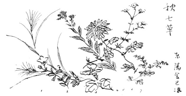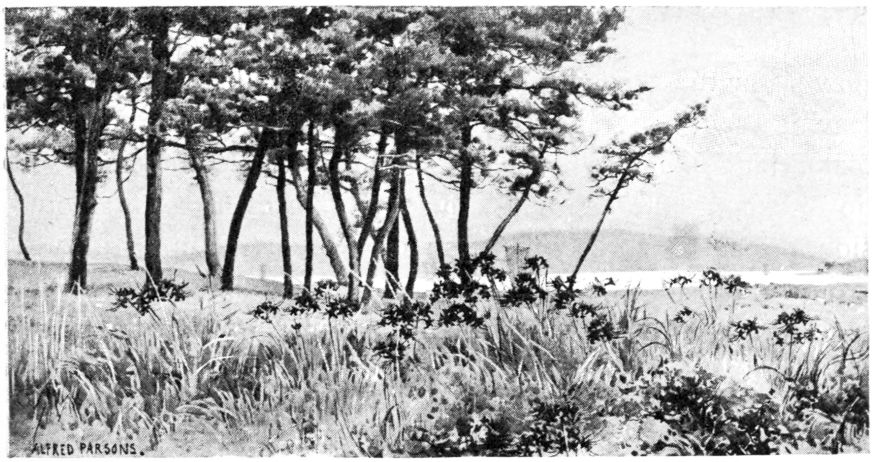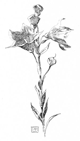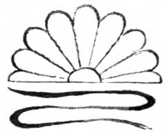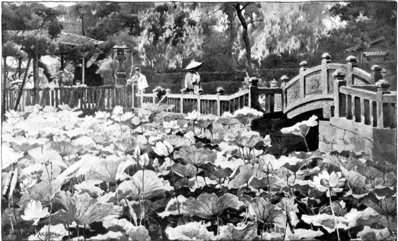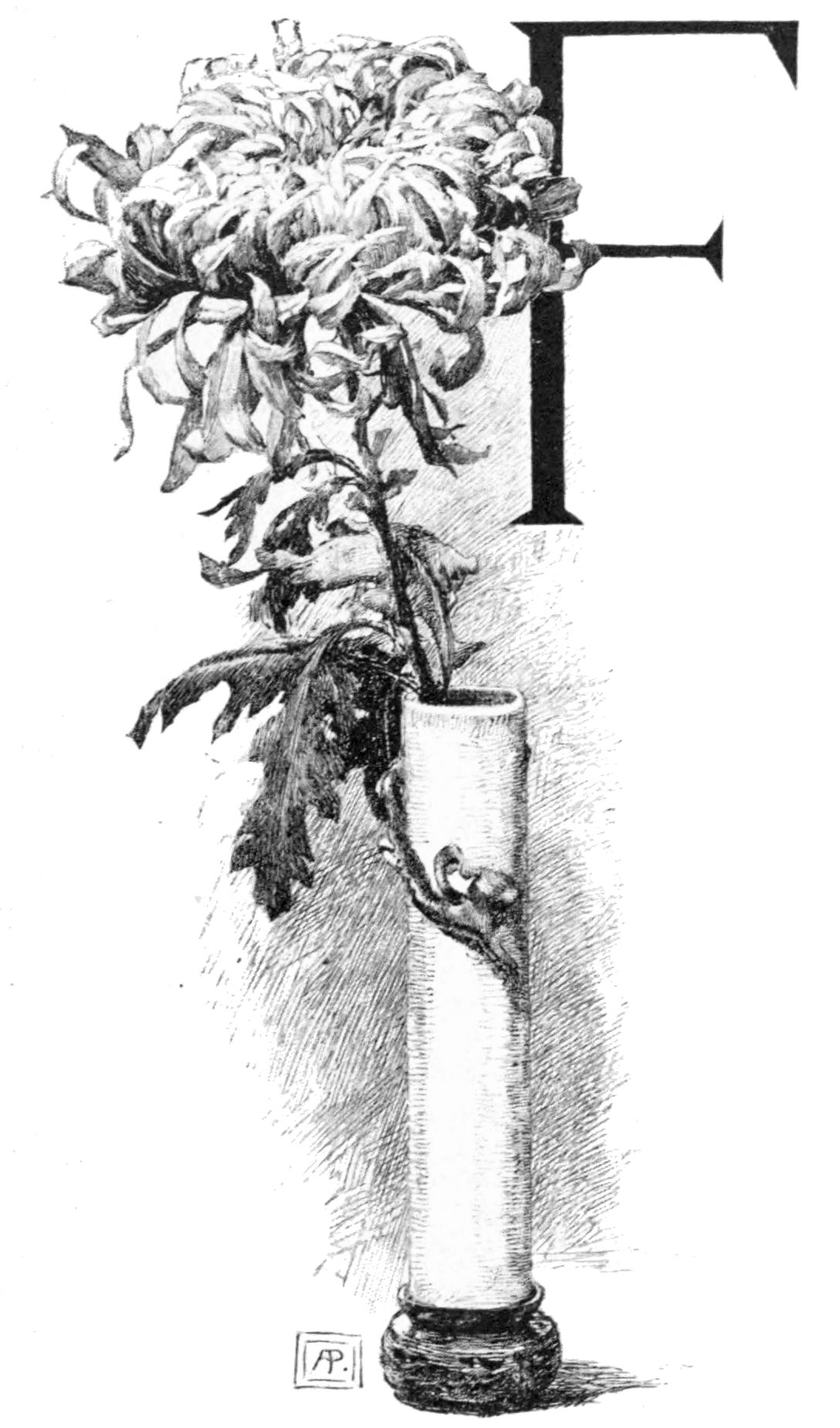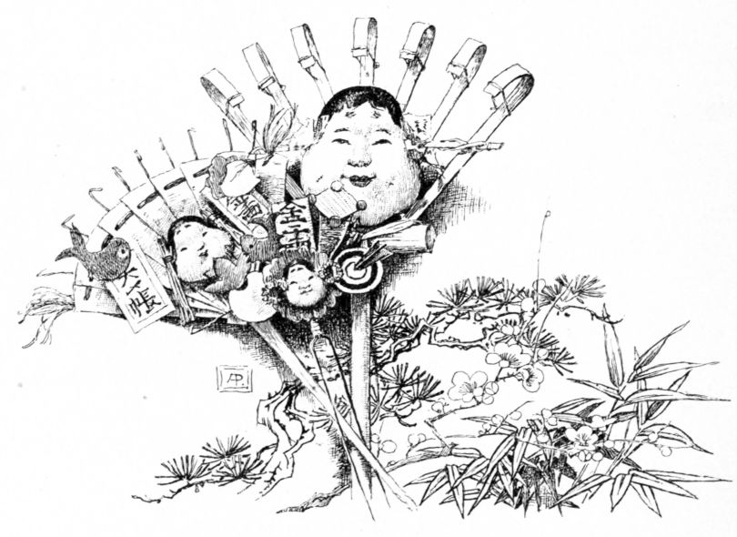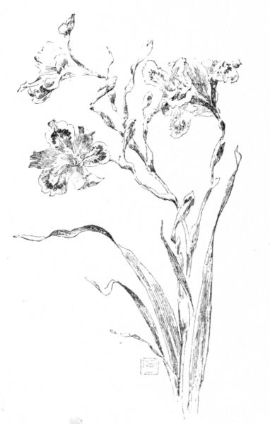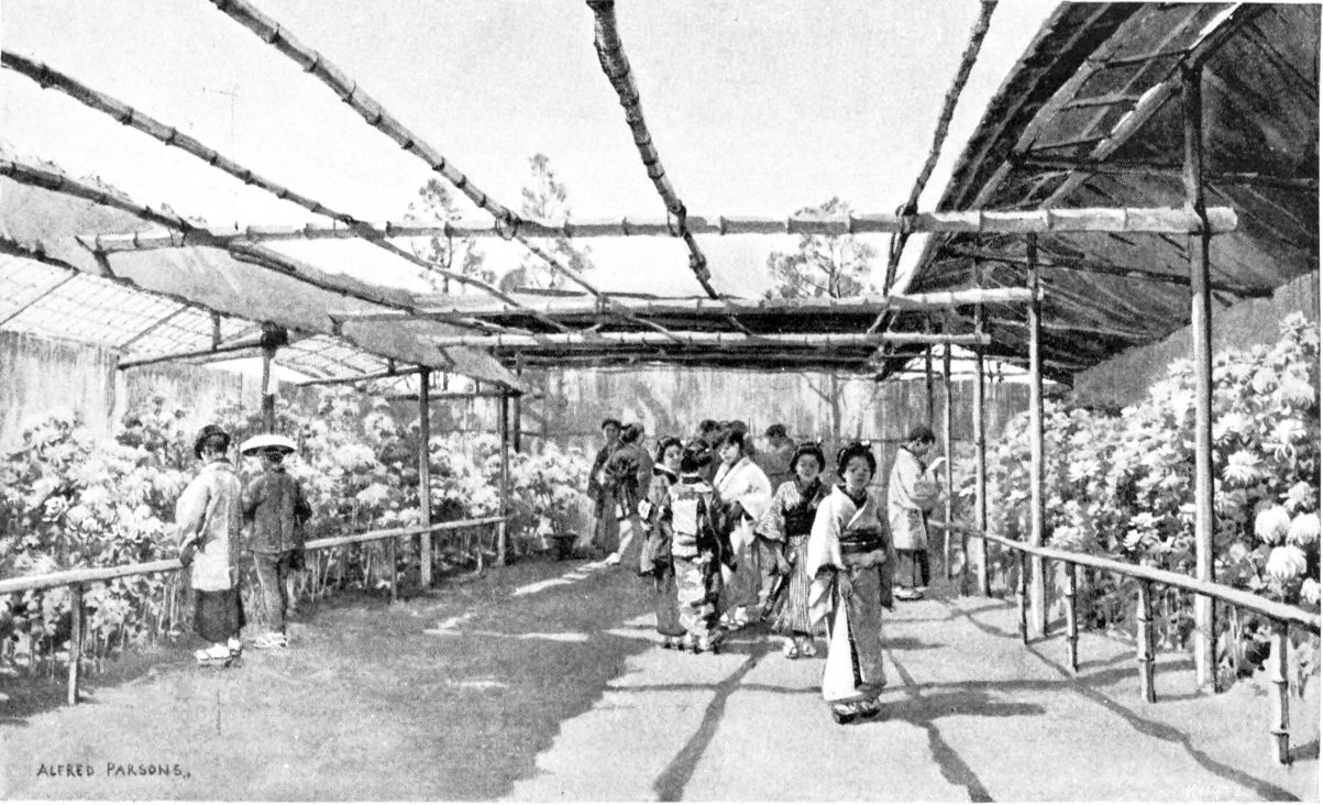 grow as they choose, but the others are trimmed into more or less formal shapes, considered suitable to the species, or helping the carefully studied arrangement of forms, which is the ideal of a Japanese gardener. There are no beds for flowers. In the little ponds the irises and lotus bloom, and in odd corners there may be clumps of lilies, chrysanthemums, or other plants, but these are mere accidents: the designer’s aim is a composition of rocks, shrubs, stone lanterns, ponds, and bridges, which will look the same in its general features all the year round, and conform to established rules. One of my Japanese friends told me, as an instance of the complexity of the landscape-gardener’s art, that if a certain shrub were used it would be necessary to place near it a stone from Tosa, the distant province where it commonly grows. The decorative garden is quite distinct from the flower garden, where the fine varieties of iris, pæony, and chrysanthemum, for which Japan is famous, are grown by professional florists, or by rich amateurs who can devote a special place to their culture.