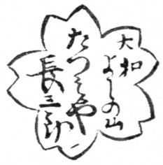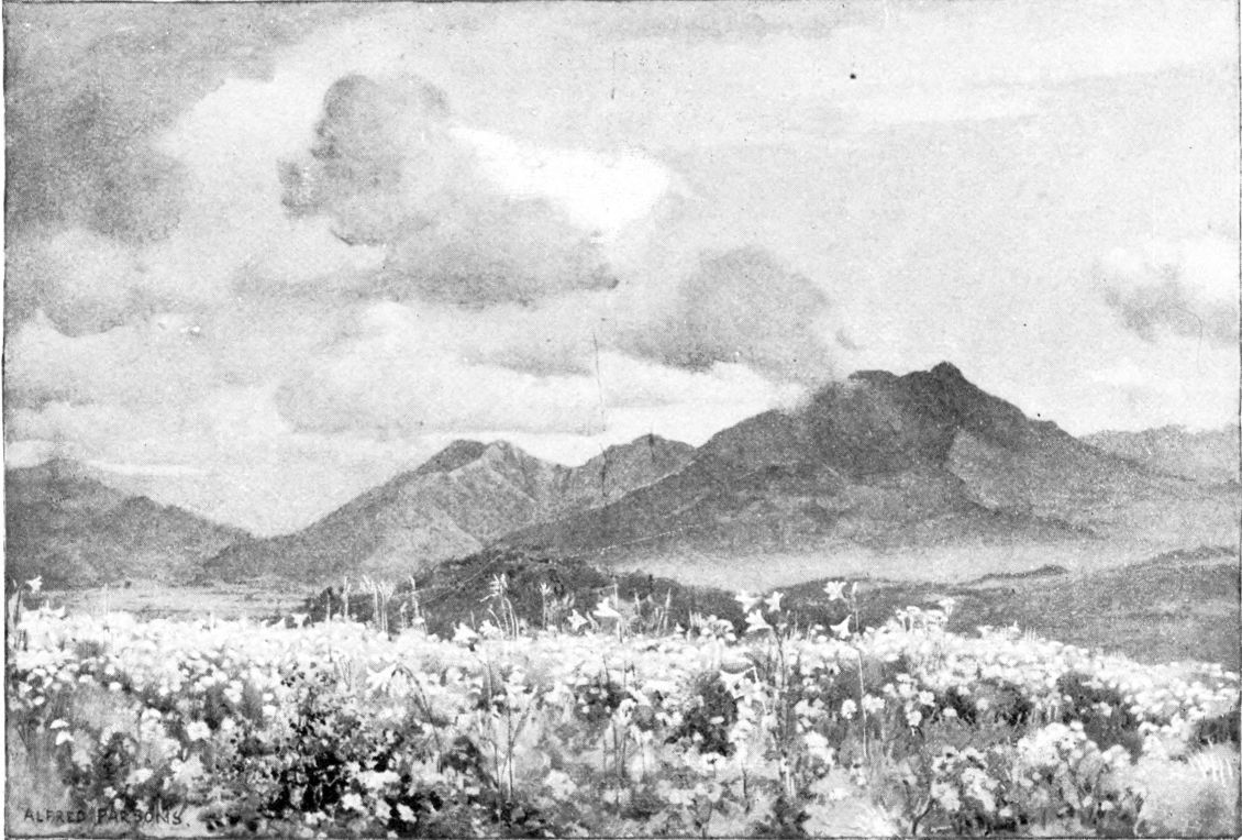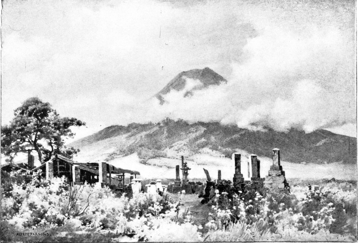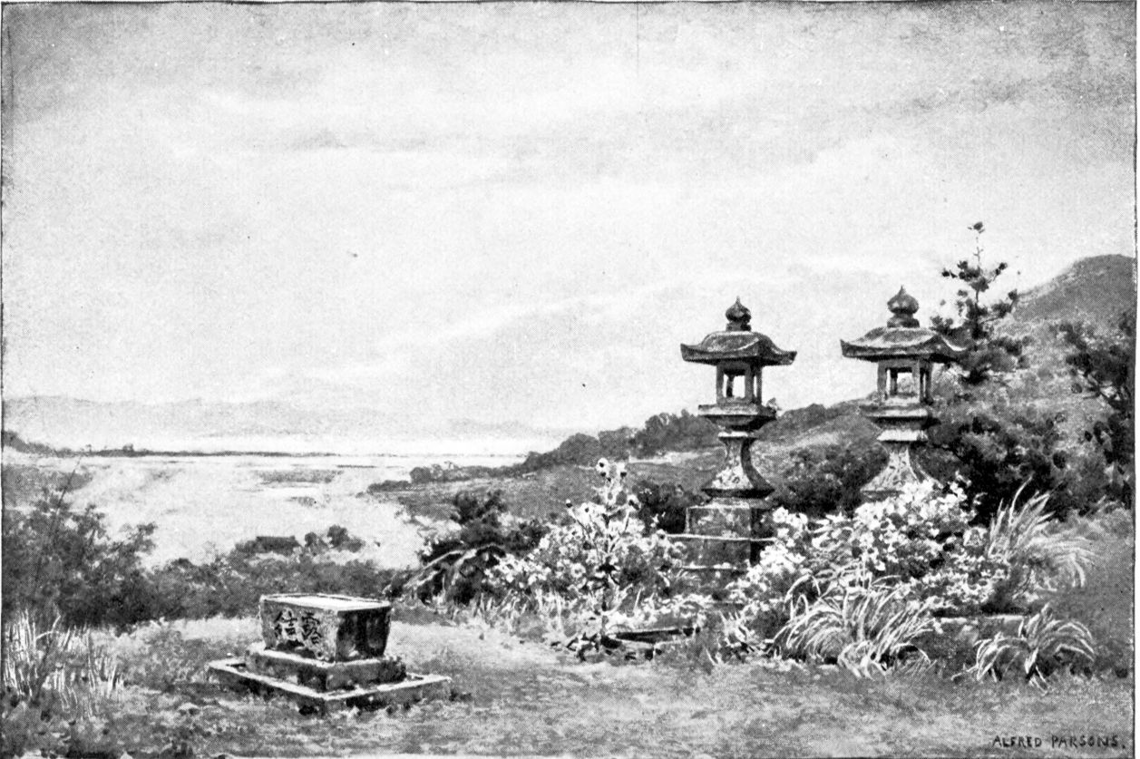 bamboos, and the rocks at that season were covered with clumps of lavender iris. From Atago-Yama, a hill just across the river, the view is fine; below are the flat, gray roofs of Hase, and the cul-de-sac in which it lies—bordered on either side with green hills, its windings indicated by the curves of road and shining river, its green surface spotted here and there with gray hamlets—gradually opens out into the wider Yamato Valley. Unebi-Yama, which marks the site of Jimmu Tenno’s mausoleum, rises in the centre of the plain, and beyond it all is an enclosing barrier of cloudy mountains.