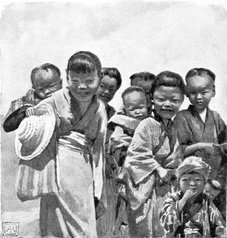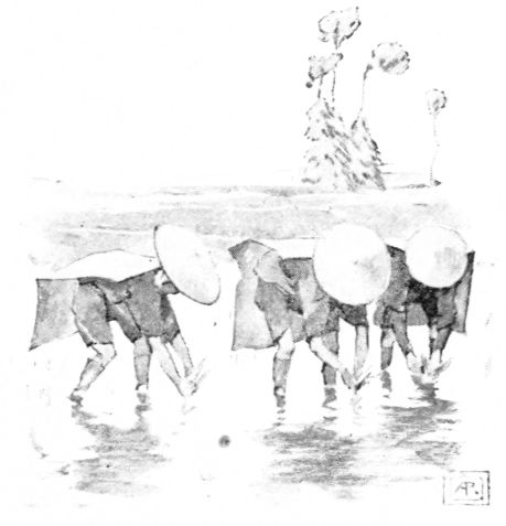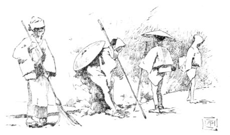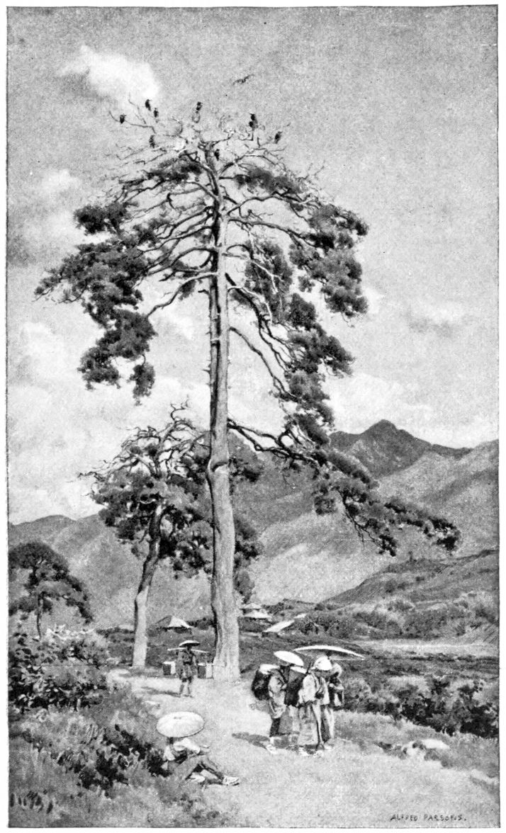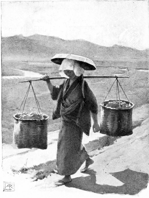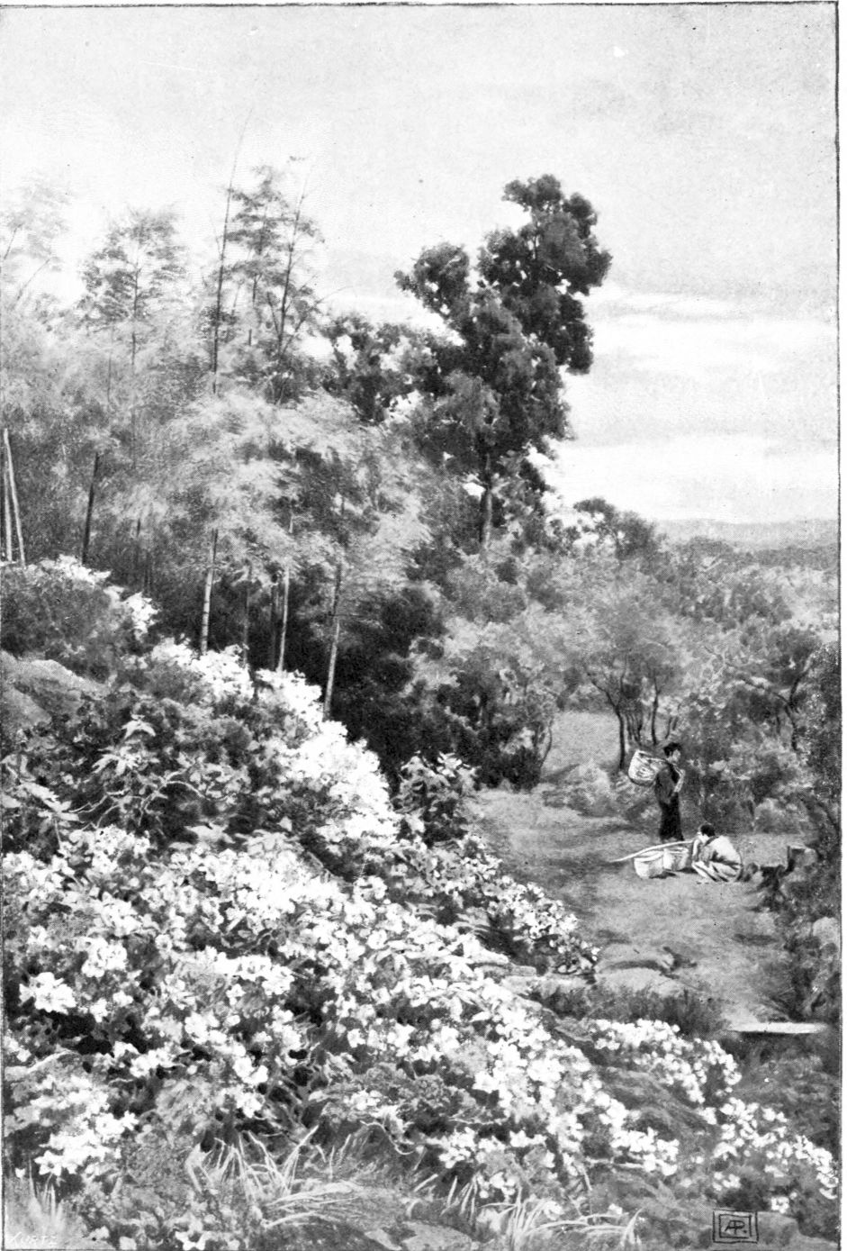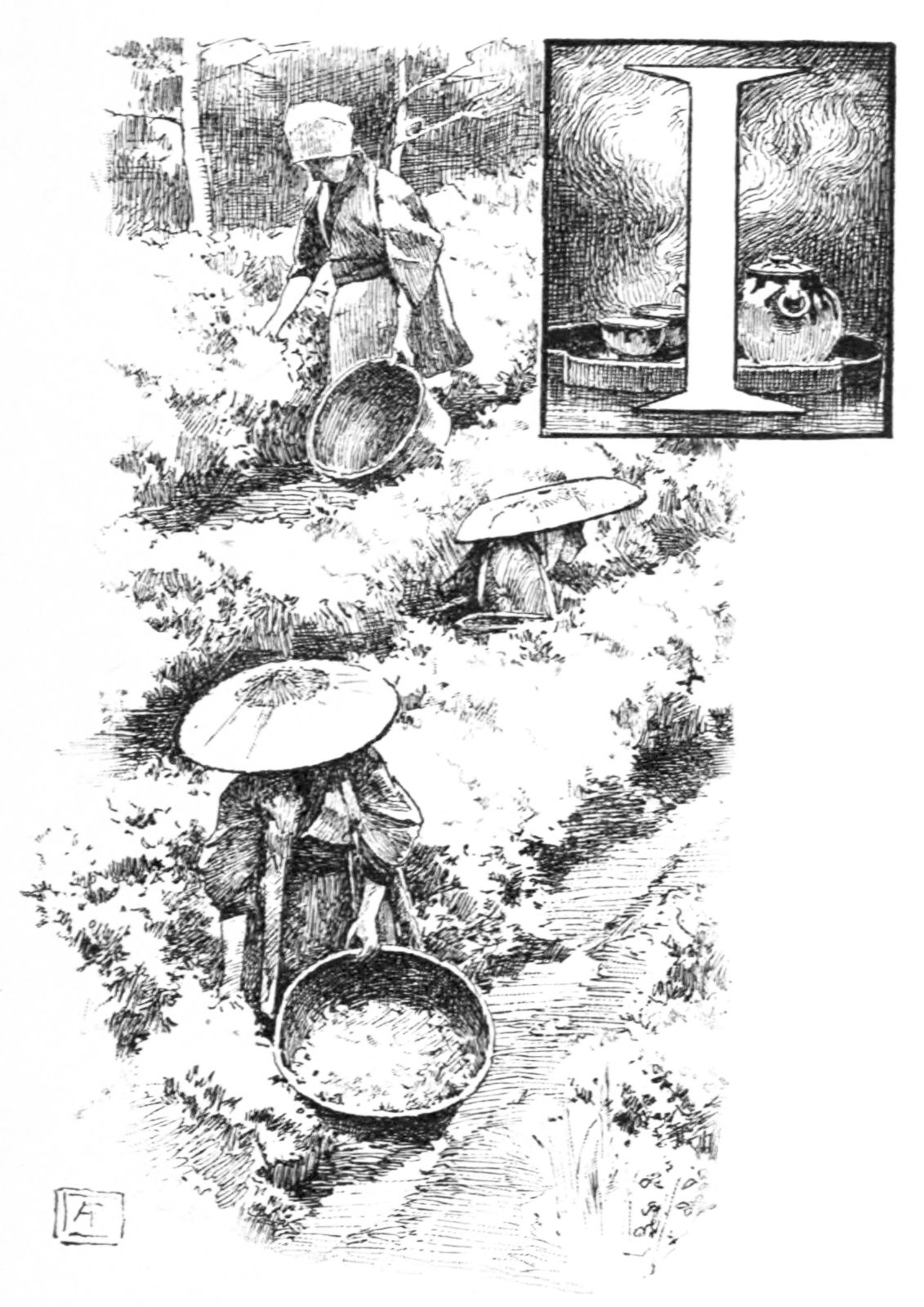 In the twelfth century Kyoto was the centre of life in Japan, and the district of Uji, between that city and Nara, has always kept its reputation for producing the finest tea. The most valuable leaves are those on the young spring shoots, and when I passed through on the 19th of May these were just being gathered and dried. Most of the{47} shrubs grow in the open air without any protection, evergreen bushes from two to three feet high, and among them the women and children were at work. As they squatted by the plants, filling their baskets, very little of them was visible, but their big grass hats shone in the sun, looking like a crop of gigantic mushrooms. The Japanese “kasa” is made of various light materials—straw, split bamboo, rushes, or shavings of deal; it is used, like an umbrella tied to the head, as a protection against sun and rain; in the evening or on cloudy days it is laid aside, and the laborers wear only their cotton kerchief, spread out like a hood, or tied in a band round their brows. Though it cannot be called the “vast hat the Graces made,” it is, nevertheless, very effective in the landscape, and the variations of its outline in different positions indicate happily the action of its wearer.