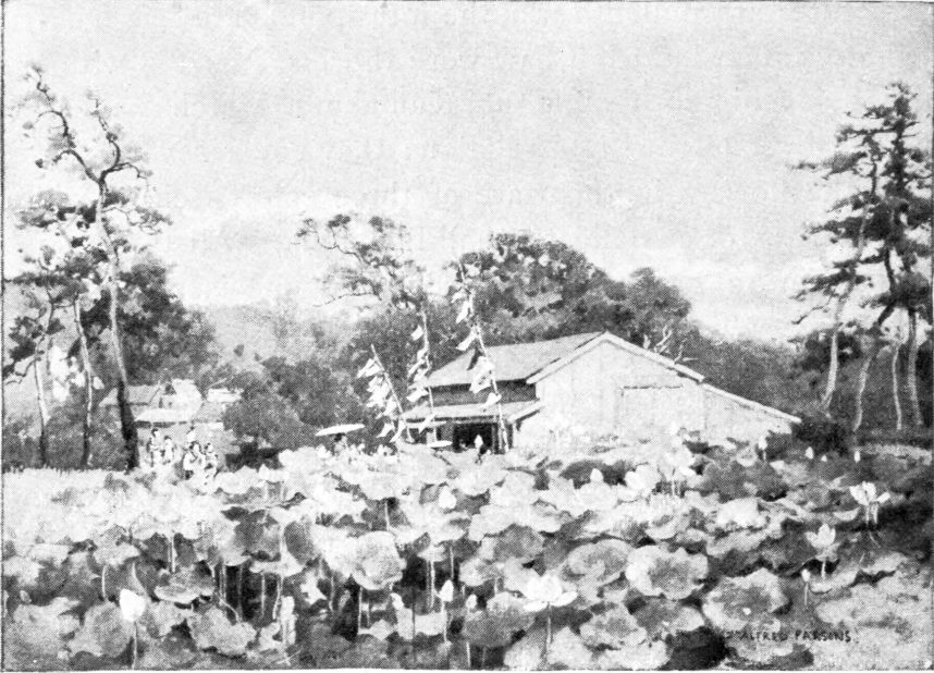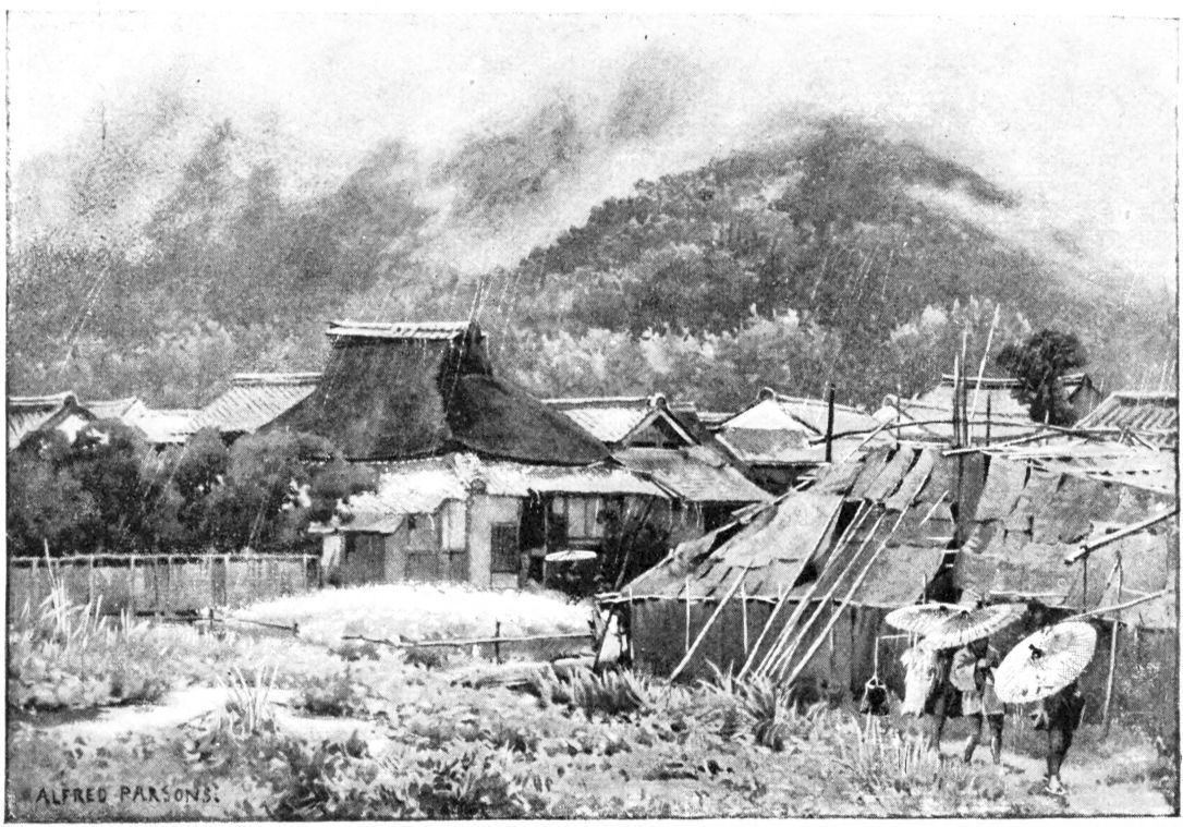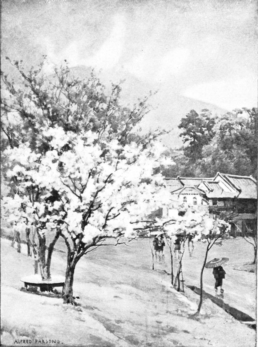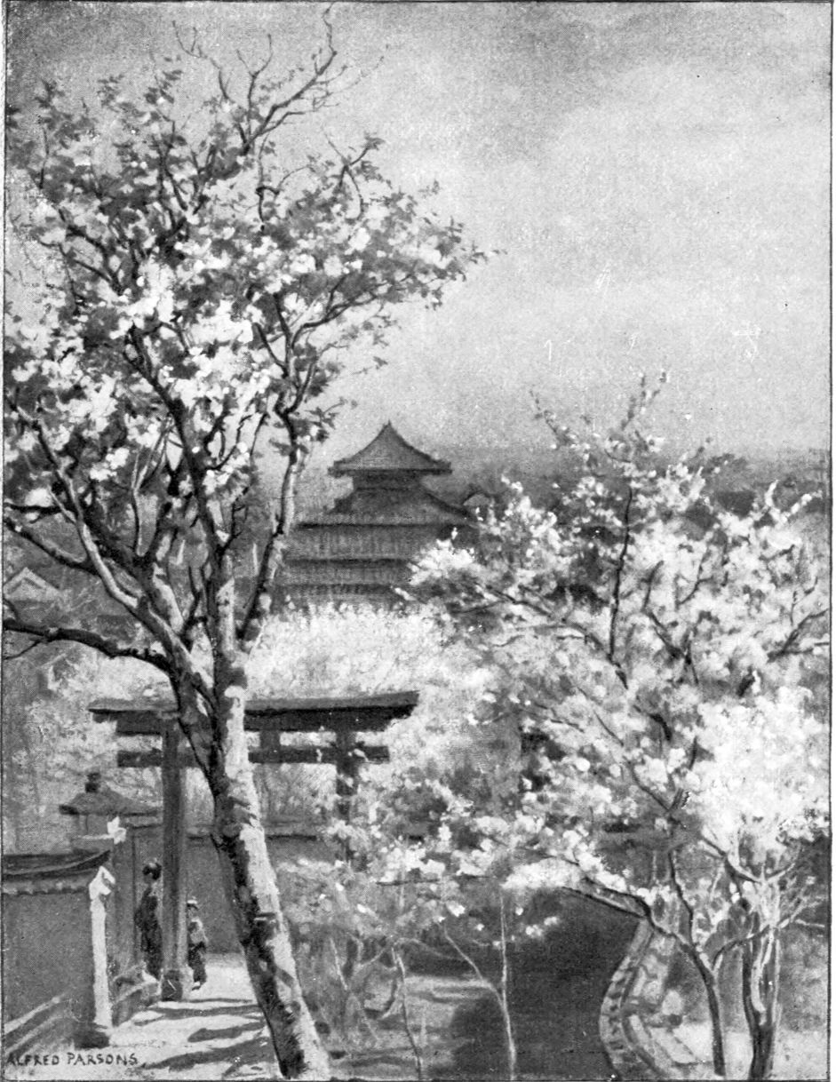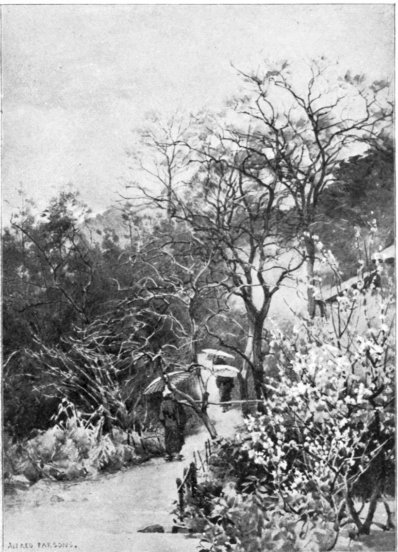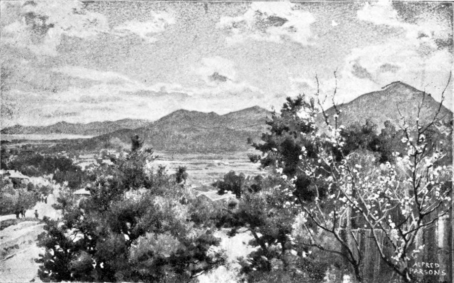 We reached Kōbe next morning, and before I had been on shore more than an hour I had heard of a village six miles away which was celebrated for its plum orchards, and had started off to find it. Okamoto lies at the foot of the hills which rise behind Kōbe on the north, and climbs a little way up them, and in front of the highest cottage, a modest tea-house with platforms arranged to accommodate the visitors who come in crowds to gaze at the blossoms, I unfolded my stool and easel, and in spite of a bitter wind and vicious little snow-storms made my first sketch in Japan. All round me and in the village below were the{6} pink-and-white trees, then a band of rice-lands, pale green with young barley, and beyond them lay Osaka Bay, and the mountains of Yamato, which constantly changed in color as snow-storms passed over, or gleams of sun lighted the shining water and the snow on the distant hills. It is an exciting thing to begin work in a new country, to compare the local color and the atmosphere with those you have tried before, and to find yourself half unconsciously using an entirely new set of pigments. I was too absorbed with these problems to take any notice of the fact that my back was aching, but after two hours, when I had finished my drawing, I found myself unable to rise from that sketching-stool, and for the next fortnight an attack of lumbago prevented my seeing anything more of the plum groves. The Buddhist pictures of their Inferno depict many ingenious tortures; I think they ought to add a man with lumbago doing six miles over a Japanese by-road in a jinricksha. When at last I got back to Okamoto there were still some blossoms, and the trees were tinged with the pink of withered petals, but the luxuriant freshness had gone.