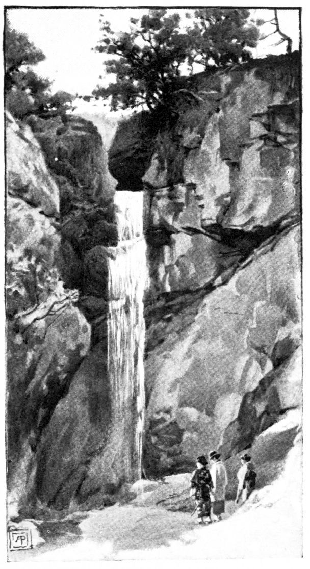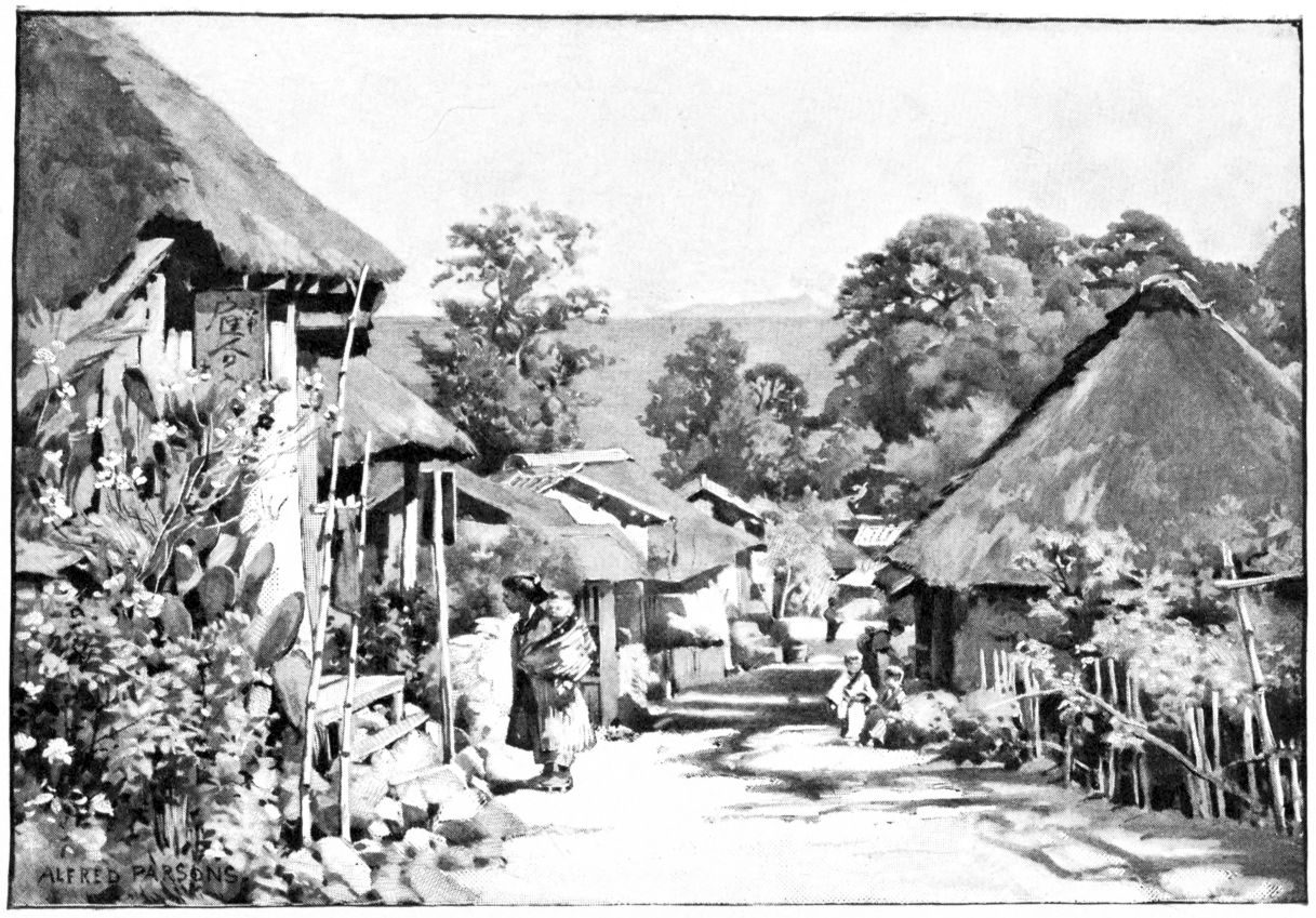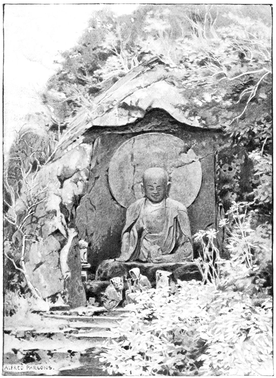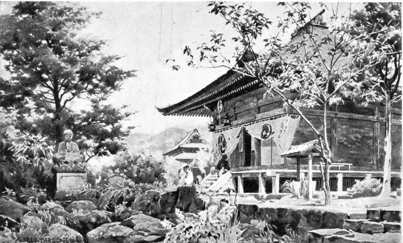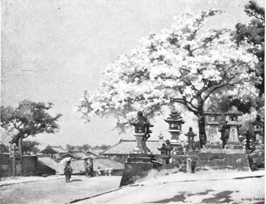 We reached Kōbe next morning, and before I had been on shore more than an hour I had heard of a village six miles away which was celebrated for its plum orchards, and had started off to find it. Okamoto lies at the foot of the hills which rise behind Kōbe on the north, and climbs a little way up them, and in front of the highest cottage, a modest tea-house with platforms arranged to accommodate the visitors who come in crowds to gaze at the blossoms, I unfolded my stool and easel, and in spite of a bitter wind and vicious little snow-storms made my first sketch in Japan. All round me and in the village below were the{6} pink-and-white trees, then a band of rice-lands, pale green with young barley, and beyond them lay Osaka Bay, and the mountains of Yamato, which constantly changed in color as snow-storms passed over, or gleams of sun lighted the shining water and the snow on the distant hills. It is an exciting thing to begin work in a new country, to compare the local color and the atmosphere with those you have tried before, and to find yourself half unconsciously using an entirely new set of pigments. I was too absorbed with these problems to take any notice of the fact that my back was aching, but after two hours, when I had finished my drawing, I found myself unable to rise from that sketching-stool, and for the next fortnight an attack of lumbago prevented my seeing anything more of the plum groves. The Buddhist pictures of their Inferno depict many ingenious tortures; I think they ought to add a man with lumbago doing six miles over a Japanese by-road in a jinricksha. When at last I got back to Okamoto there were still some blossoms, and the trees were tinged with the pink of withered petals, but the luxuriant freshness had gone.