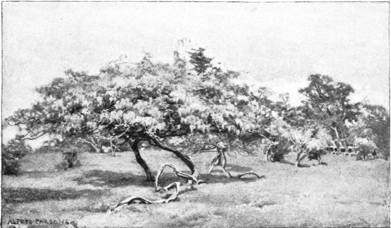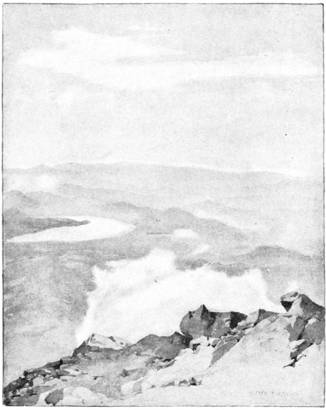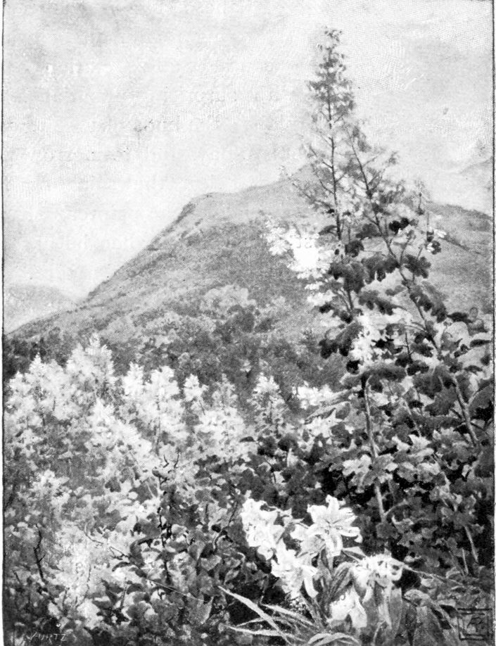 broad stream, winding through them. The grassy ridges and the few wind-beaten pines which grow on them made a fine foreground, and the little green gullies were spotted with low azalea bushes covered with flame-colored flowers. It was too good to leave, and I ought to have unpacked again and prolonged my stay for a few days; but laziness prevailed, the bore of repacking seemed intolerable, and to my lasting remorse this subject remained unpainted.