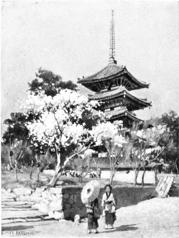 On the 13th of April I said good-bye to my friends and to the comforts of the Kōbe Club, and started for Nara, stopping on my way at Osaka to have a look at the town and see the peach blossoms on Momo-Yama (peach mountain). The narrow streets leading up the hill were crowded with visitors, and among the orchards of dwarf trees temporary tea-sheds and resting-places had been erected for their comfort and refreshment. In spite of the many picturesque features in these fêtes the whole effect is at first disappointing: railings and stages of new raw deal, the untidy and unfinished look of rough bamboo structures, with corners of matting hanging loosely in places where they interfere with the perspective lines, the slovenly pathways,{7}