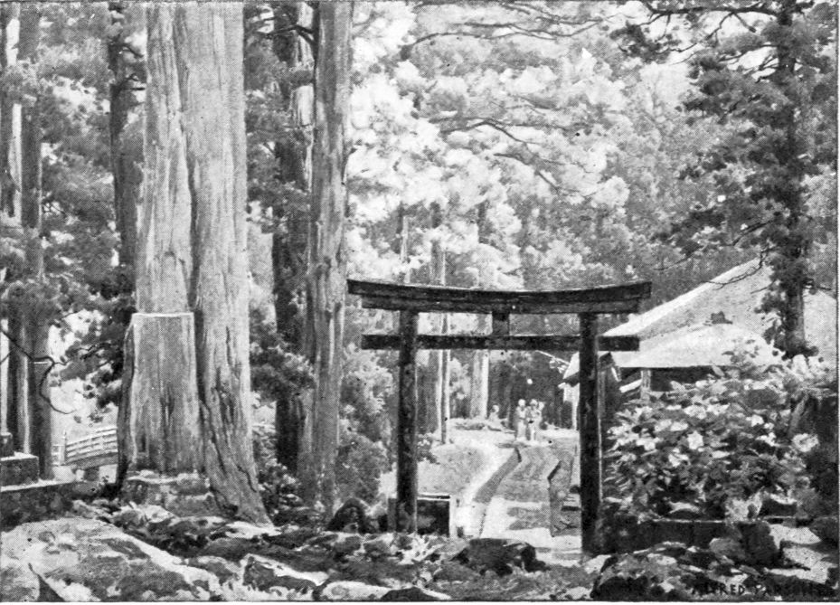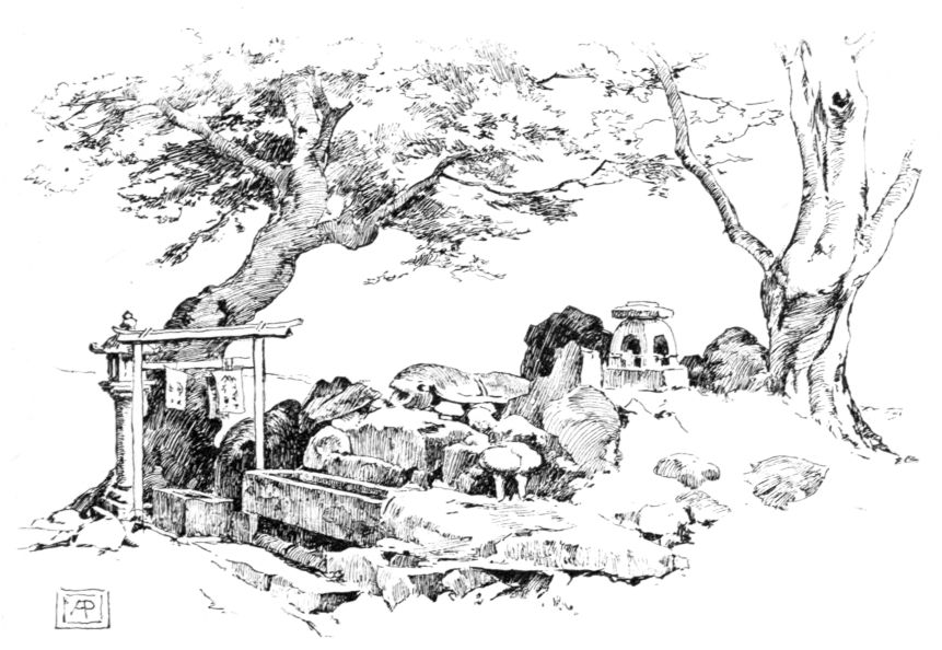 Though I had read much about life in Japan, it was an embarrassing experience to be set down for the first time with my baggage in a Japanese room, and to try and adapt myself mentally to the possibilities of living under such conditions. In a bare hut or tent the problem is comparatively simple; there is always one way by which you must enter; but in a Japanese room there is too much liberty; three of the walls are opaque sliding screens, the fourth is a transparent, or rather translucent, one; you can come in or go out where you like; there is no table on which things must be put, no chair on which you must sit, no fireplace to stand with your back to—just a clean, matted floor and perfect freedom of choice. European trunks look hopelessly ugly and unsympathetic in such surroundings, nor are matters much improved when the host, in deference to the habits of a foreigner, sends in a rough deal table, with{10} a cloth of unhemmed cotton, intended to be white, and an uncompromising, straight-backed deal chair. These hideous articles make a man feel ashamed, for though they are only a burlesque of our civilization, they are produced with an air of pride which shows that the owner is convinced they are the right thing, and one cannot but be humiliated by their ugliness and want of comfort. Yet if you want to read or write you have to keep them and make the best of them, for a long evening on the floor is only to be borne after a good many weeks of practice. Things begin to look brighter and pleasanter when the little waiting-maid appears, bringing first some cushions and the hibachi, with its pile of glowing charcoal, and then the tea-tray and a few sweet cakes. This was more the sort of thing I had expected, and made me at once feel at home with my surroundings. It is the first attention shown you in every tea-house, no matter how humble; whether you go as an inmate, or whether you merely sit down for a few minutes’ rest on a journey, the little tea-pot and the tiny cups are at once produced, and the hibachi is placed by your side, a pleasant and friendly welcome, which never failed to make its impression on me, however poor the quality of the tea might be. The Kiku-sui-ya (which means Chrysanthemum-water house) is near the entrance to the great Kasuga Park at Nara; just outside it the road passes under a granite torii flanked with stone lanterns, and winds up to the temple through an avenue of cryptomerias, with rows of lanterns on each side, which get closer and closer together as they near the temple buildings, and are so numerous that tradition says they have never been counted. There are booths here and there where pilgrims can rest and get a cup of tea, for pilgrimage in Japan is not made unnecessarily uncomfortable, and where the tame deer congregate to take the nuts and cakes which are sold{11}