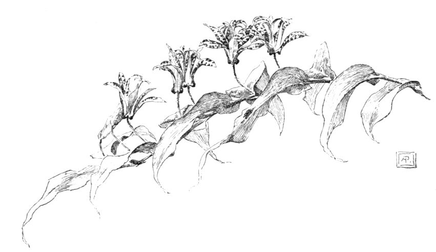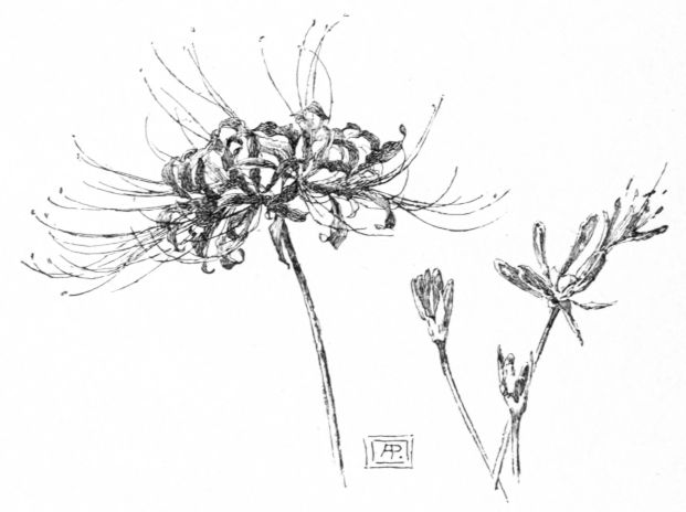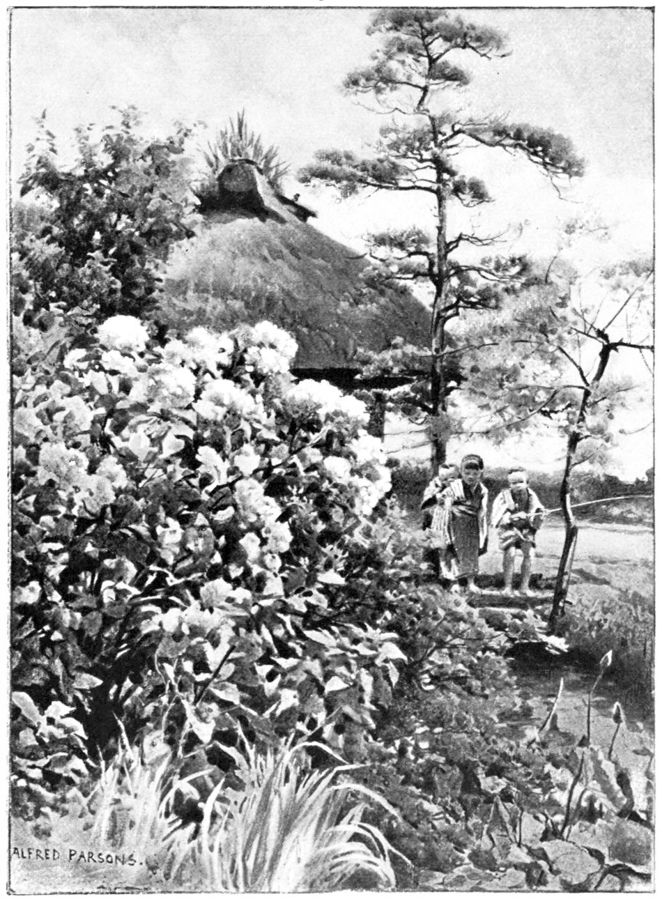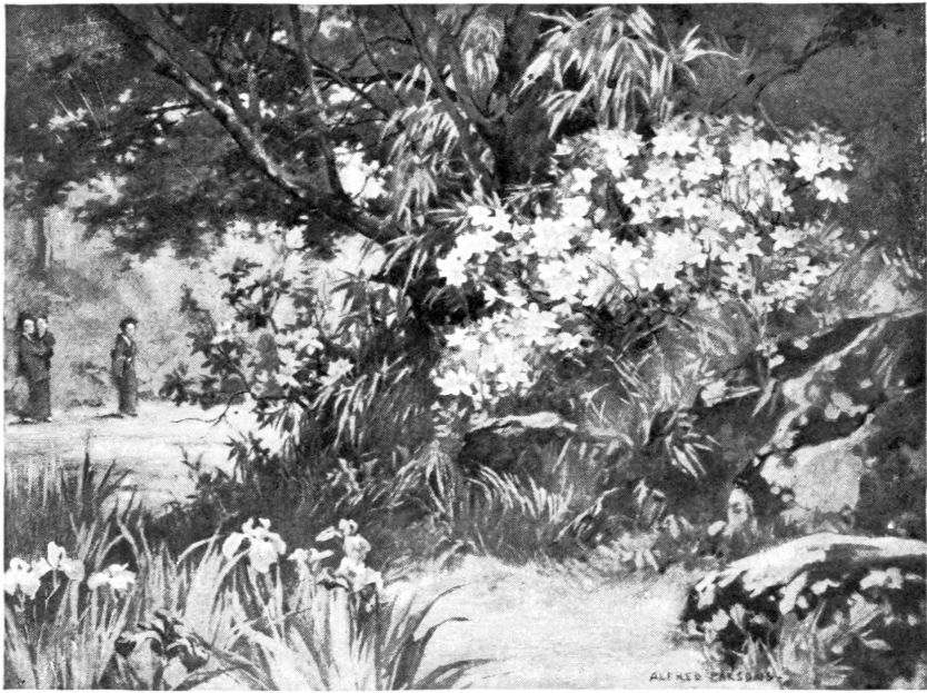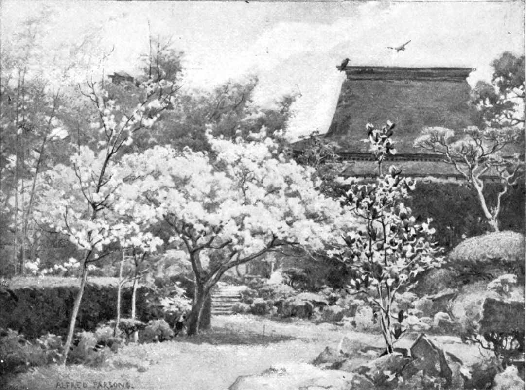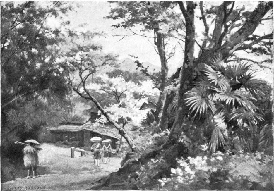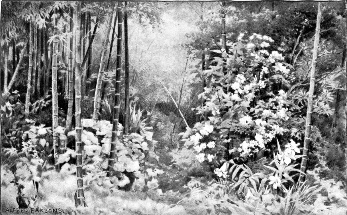 It is a warm climate too, and everything grows luxuriantly. There are great clumps of bamboo, enormous azalea bushes, and thick undergrowths of palmetto. On the road-side banks in this last week of April, there were ferns just unrolling, the fronds of maidenhair (Adiantum pedatum) all bright-red young shoots of lily and orchid and Solomon’s-seal, and a lovely iris (I. japonica), with many lavender-colored flowers on a branching stalk, each outer petal marked with dark purple lines, and decorated with a little horn of brilliant orange. The gardens of tea-houses and temples were gay with azalea, camellia, magnolia, and cherry, and with the young leaves of maple and andromeda, as bright as any flowers. During a great part of the year these gardens have but few blooms—they are only an arrangement of greens and grays—but in the spring no amount of clipping and training can prevent the shrubs from blossoming. The cherry-trees and magnolias are let{27}
