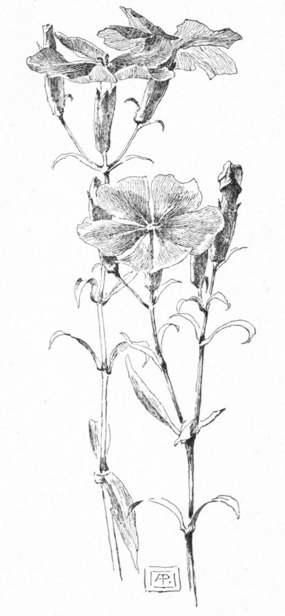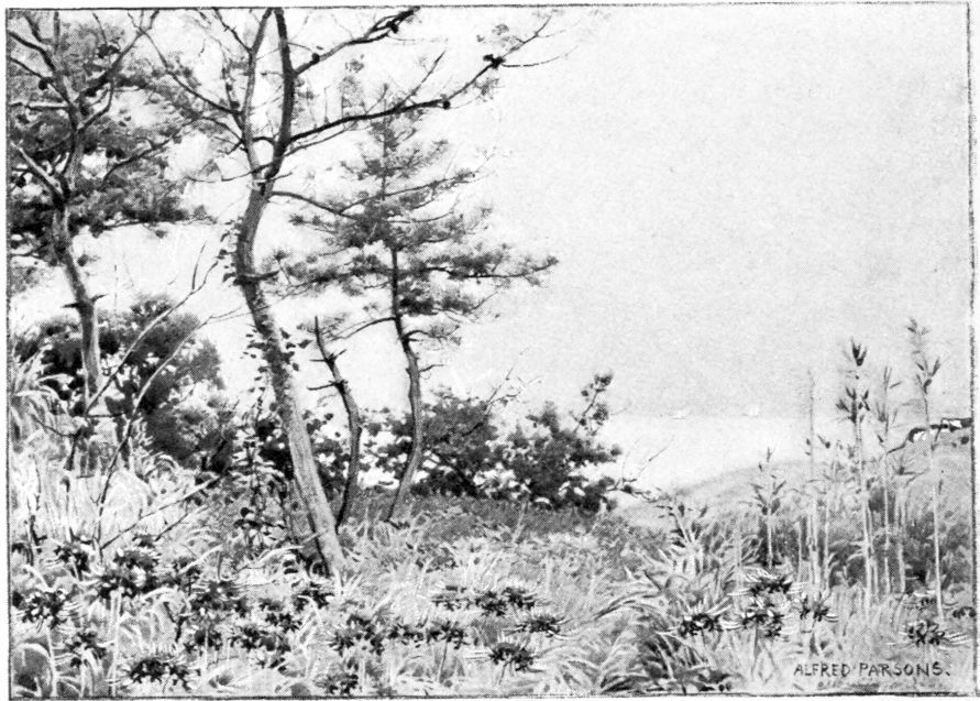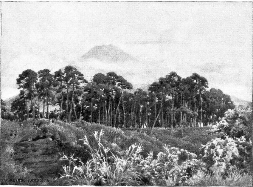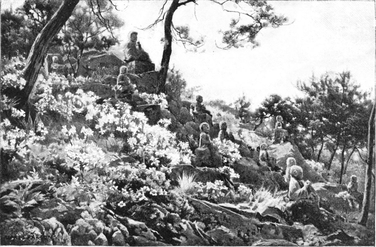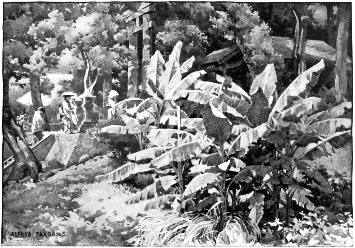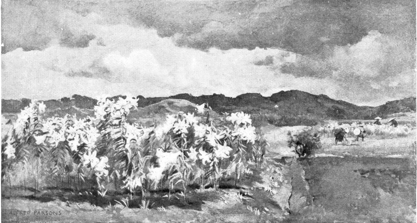 It is a warm climate too, and everything grows luxuriantly. There are great clumps of bamboo, enormous azalea bushes, and thick undergrowths of palmetto. On the road-side banks in this last week of April, there were ferns just unrolling, the fronds of maidenhair (Adiantum pedatum) all bright-red young shoots of lily and orchid and Solomon’s-seal, and a lovely iris (I. japonica), with many lavender-colored flowers on a branching stalk, each outer petal marked with dark purple lines, and decorated with a little horn of brilliant orange. The gardens of tea-houses and temples were gay with azalea, camellia, magnolia, and cherry, and with the young leaves of maple and andromeda, as bright as any flowers. During a great part of the year these gardens have but few blooms—they are only an arrangement of greens and grays—but in the spring no amount of clipping and training can prevent the shrubs from blossoming. The cherry-trees and magnolias are let{27}