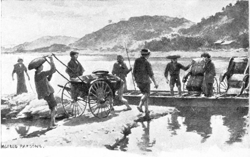 Our route for two or three miles, as far as the river Yoshino-gawa, was the same that I had climbed on my way up; but nine days had made a great difference in its aspect. Then many of the trees were still bare; now they were covered with spring leaves. After ferrying over to Muda we turned northwards, and a good road led us by low passes and through the grand forests at the foot of Mount Tonomine down to Tosa in the Yamato Valley. Jinricksha travelling is very pleasant when the roads are good, the weather fine, and the men active; there is no noise of horses’ hoofs to disturb the mind, the straw-sandalled feet of the coolies hardly make a sound, nor is your attention distracted from the landscape by having to drive; and the frequent short halts at way-side tea-houses give you a chance of airing your few phrases of Japanese and seeing the ways of the people. My lunch at Tosa was{31}