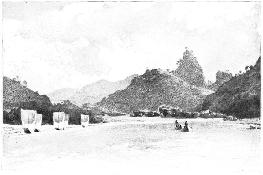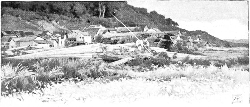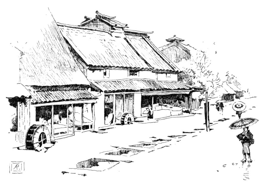 The main street of Hase is cut up with rivulets; the middle one is used for all domestic purposes, and at all hours you may see the women, with skirts and sleeves tucked up, washing their clothes or their fish and vegetables, and ladling up water for baths and cooking with their long-handled wooden dippers. The side streams turn small water-wheels, which work wooden hammers for pounding and cleaning the rice—an important part of the day’s work in every Japanese village. In the most primitive places it is done with a long-headed wooden mallet and the stump of a tree hollowed out for a mortar; in others big wooden hammers are fixed on a pivot, and are raised by stepping on the other end of the handle, tread-mill fashion. A mountain brook, the parent of these little streams, tumbles along close behind the houses; its banks are overhung with{35}