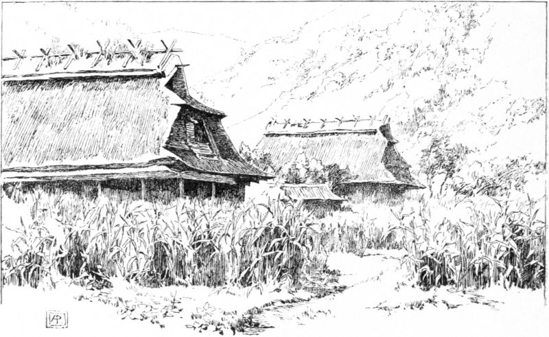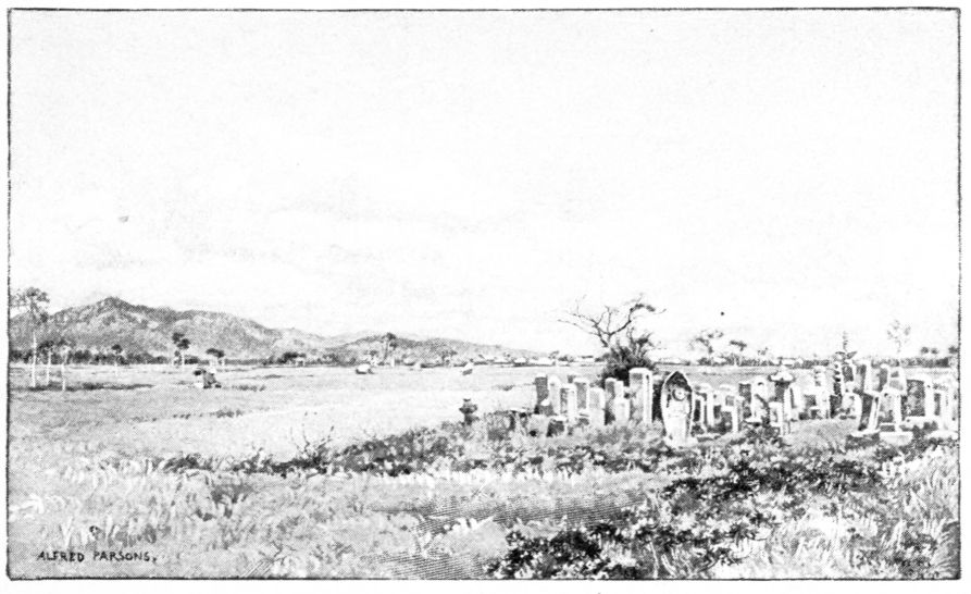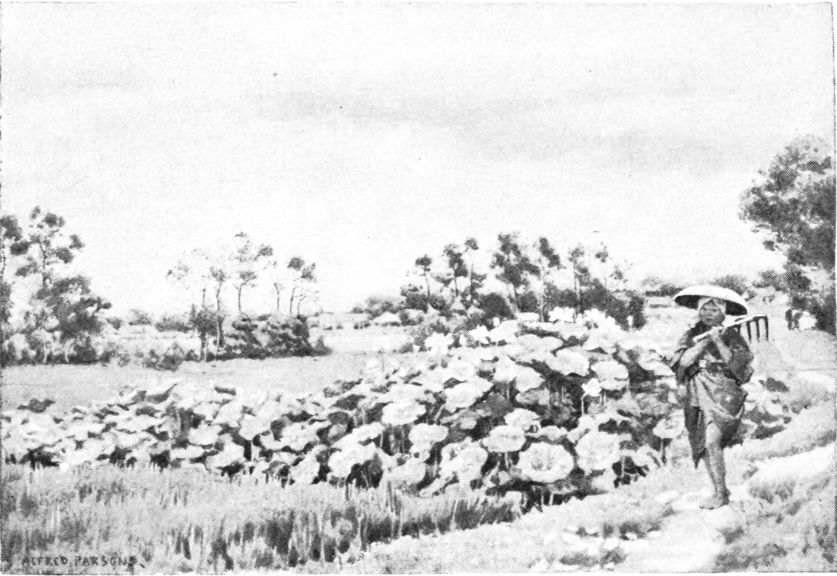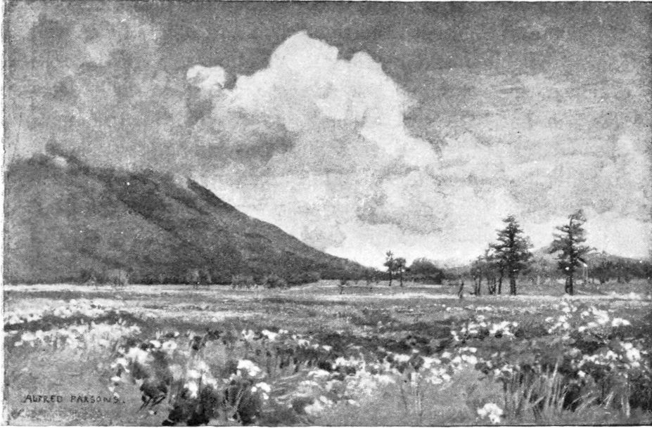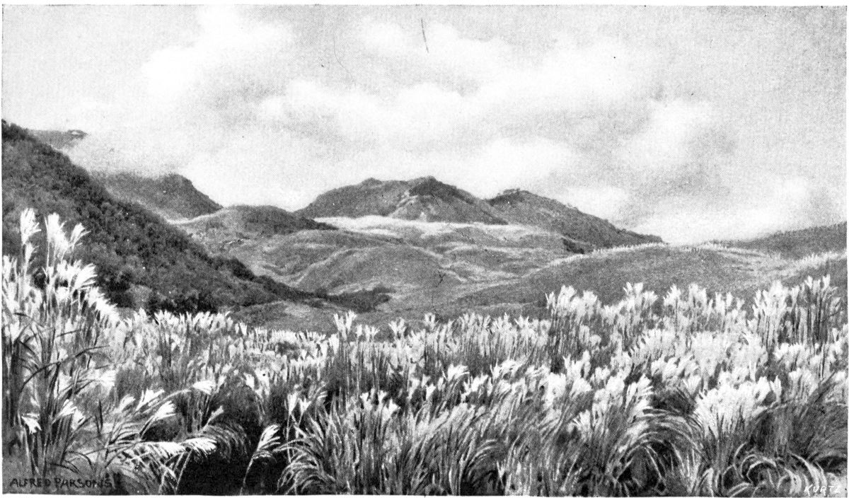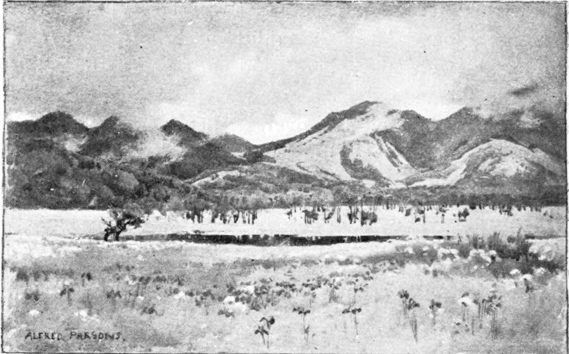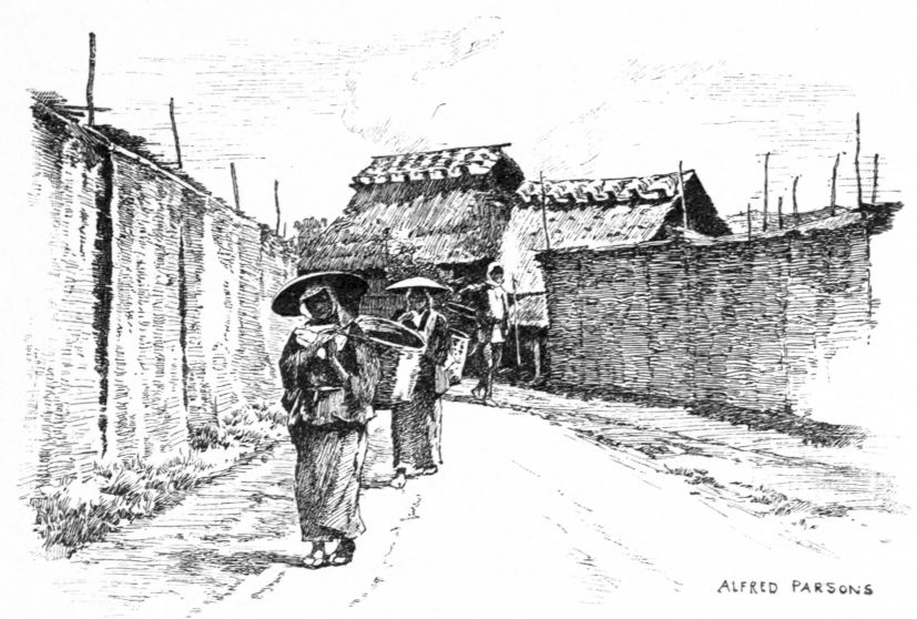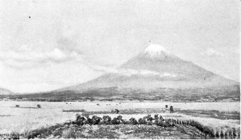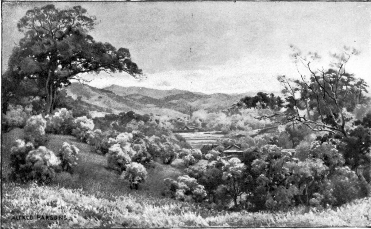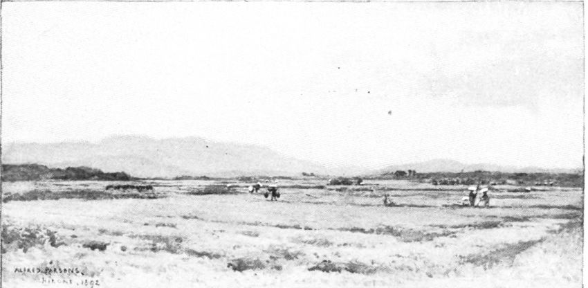 which are mud or dust according to the weather—all these things make unsatisfactory accessories for the figures and the flowers. After a time they obtrude themselves less on your notice, and you have learned to accept the fact that Japan is not a country of big masses and broad effects, but of interesting bits and amusing details. This is usually true of its landscape; the forms of mountains and trees are more quaint than grand, and the cultivated land has no broad stretches of pasture or corn, but is cut up into patches, mainly rice-fields, with various vegetables grown in little squares here and there.