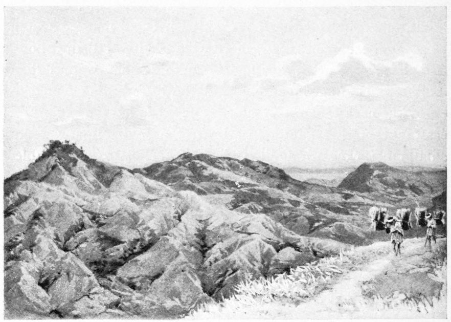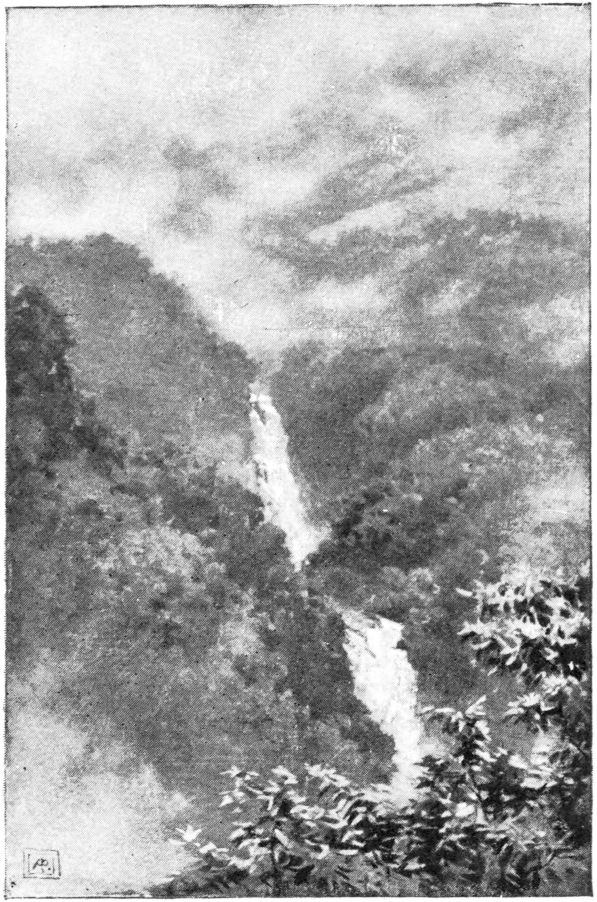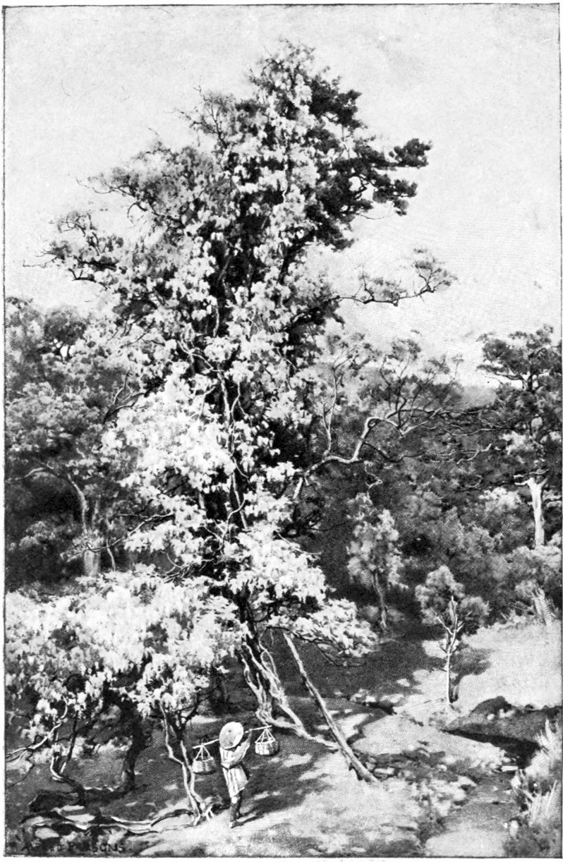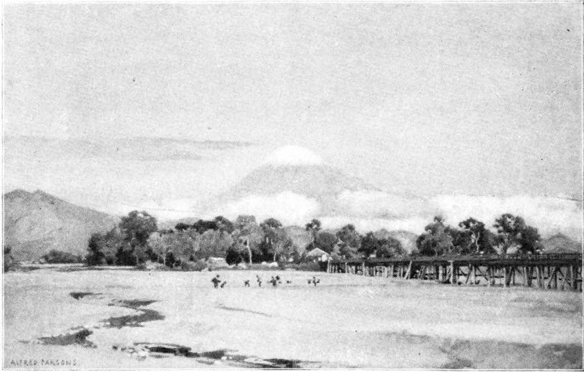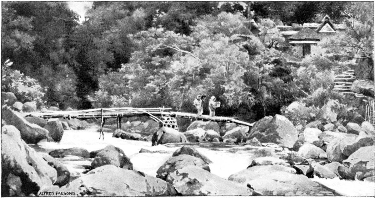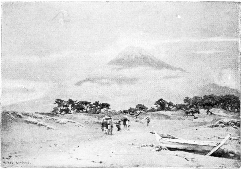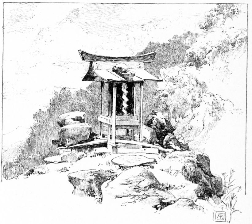 The village street of Yoshino winds up a spur of the hills, passing many temples and little hamlets, and gradually becomes a steep and stony mountain path, which ascends to Mount Omine. The great tracks of forest provide occupation for most of the people in this district; as I sketched by the road-side strings of men and women were constantly passing, carrying down heavy loads of wood and charcoal from the hills, and in front of many of the cottages match-wood was spread out on mats to dry. It was difficult to understand how it could ever get dry, for all the mists of Japan seemed to collect round these mountains and forests; the landscape was rarely free from them, and constantly looked like a Japanese drawing, all vague and white in the valleys, with ridges of hill and fringes of pine showing in sharp clear lines one behind the other.