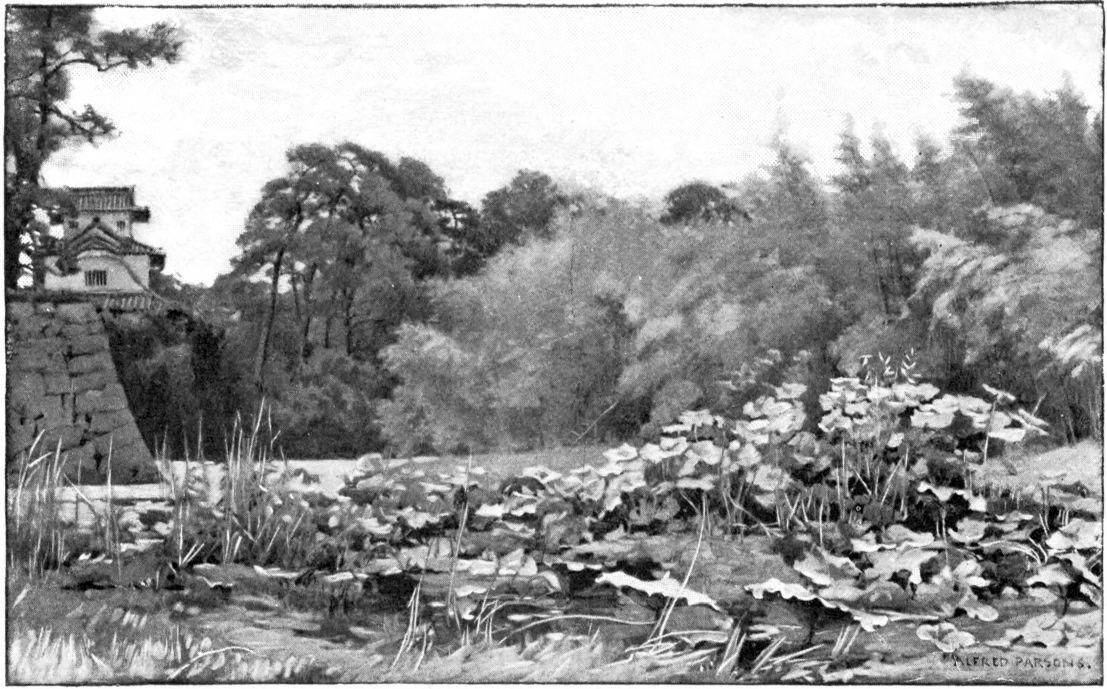 led to many acts of vandalism, most of them were pulled down, and this one at Hikone was only just saved from destruction by the intervention of the Emperor; now that a reaction has set in, and the Japanese official mind is not so eager to forget the past and obliterate its relics, they are likely to be carefully preserved. All of them have a massive foundation of large stones, not squared except at the angles, but carefully trimmed and fitted together without mortar; and the superstructure is of timber and plaster, with roofs and eaves of heavy tiles or metal. The moats, overhung with pines and filled with lotus during the summer months, are always interesting. It was a blazing hot day when I walked