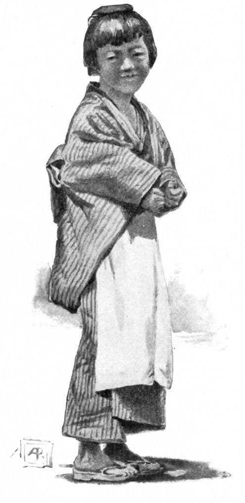 for them to the passers-by. From early morning till nearly sundown this road is lively with groups of visitors. Nara is so near to Osaka that among them a sprinkling of men, mostly no doubt engaged in commerce, wore foreign dress, but the majority of the people were in their native clothes, and as I sat and painted by the road-side I could study the variations of Japanese costume—from that of the old peasant with his white or blue