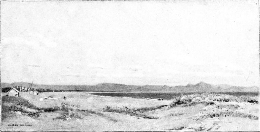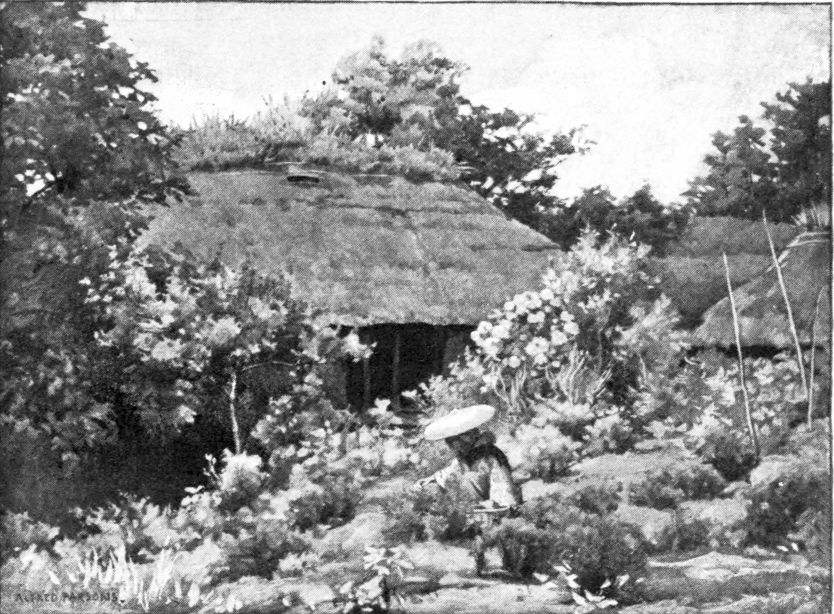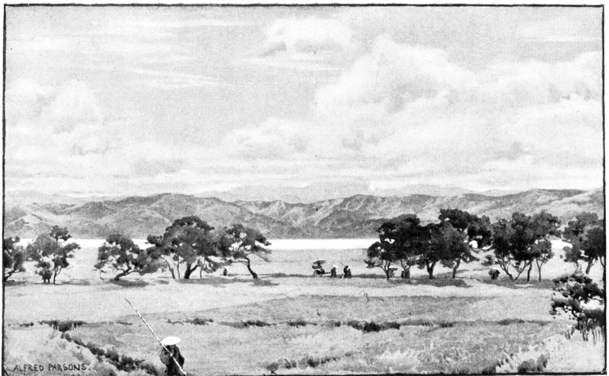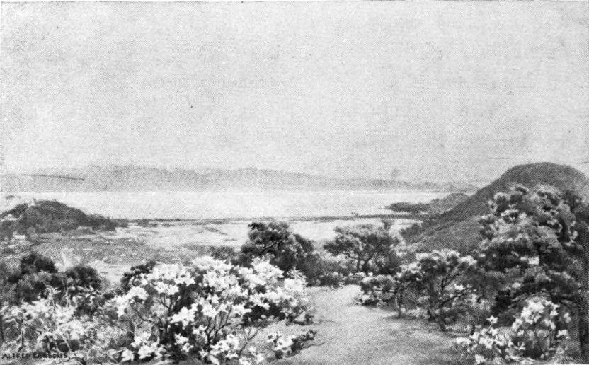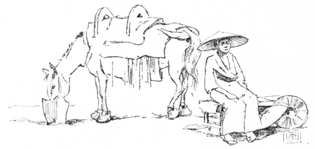 up and examined the castle; there was not a cloud in the sky, and Lake Biwa and its mountains lay still and clear and soft in the delicate blue haze which seems to be their own peculiar property. The fields outside the town were covered with a bright pink flower like a clover, which is not used for fodder, as there are hardly any animals to feed, but is dug in to improve the land for the rice, and this blaze of color consoled me for not finding as many azaleas as I ex{56}pected. I set to work at a study of it, and sent my boy Matsuba, who, with the quickness of his race, quite understood the kind of thing I was looking for, to search the neighborhood for azalea bushes. He came back early in the afternoon to tell me that he had not been successful, but that there were some races going on in the town, so we wandered up, and established ourselves in a room just over the starting-post. The course was about two hundred and fifty yards along the pebbly bed of a dry river, and all the arrangements were very unlike those of a European racecourse. Two upright posts of bamboo stood about five yards apart, with a stout pole slung between them; the vicious little ponies were brought along by two grooms, each holding a long cord fastened to the bridle, and with a good deal of shoving and hustling were wedged in, shoulder to shoulder, between this pole and another behind them at about the height of their hocks. Their heads were pulled over the front pole, and held firmly by a groom with a long running cord through the bridle rings, while the jockeys were fully occupied in preventing the little brutes from striking each other with their fore and hind legs. Meanwhile the spectators, who had kept at a respectful distance until the ponies were safely fixed, crowded up behind them, pulling their tails and whacking them with bamboos. The starter then appeared, made a few remarks, and beat a small drum, upon which the men in charge of the pulleys dropped the front pole, the grooms slipped their ropes out of the bridle rings and jumped aside, and the ponies scrambled off as best they could. The jockeys rode without saddles or stirrups, with their great toes hitched into a surcingle, and directly they were off they dropped the reins, held their left hands in the air, and plied their whips with the right until they had passed the winning-post. It was just a scurry, with no time for scientific riding, and, as far as I could see,{57} the pony who got over the pole best always won. O Kazu San, my waitress at the Raku-raku-tei, was helping at the tea-house, and kept me supplied with tea and cakes, and I stayed watching the races and the spectators, and being watched by them, until the dusk put a stop to sport. I left too soon, for my boy told me that there was a fight afterwards about a bet; it was the only fight I heard of while I