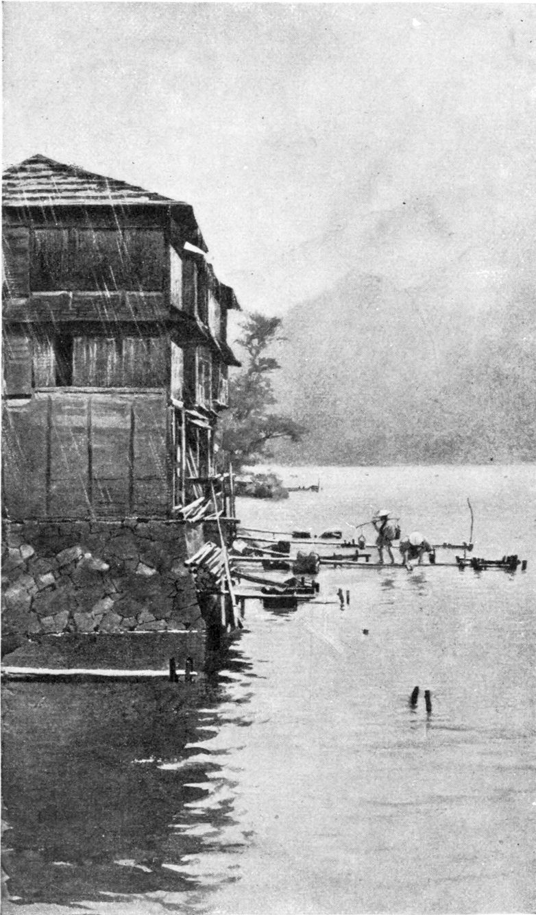 I reached Hikone by rail the same evening, and took up my quarters at the Raku-raku-tei tea-house, a great rambling place, with a large garden and suites of rooms to suit all tastes. I was shown into a gorgeous apartment with gold screens, its floor raised above the level of the rest of the house, which no doubt was intended for great people, who in the old days must often have come here to see the Daimio, Ii Kamon no Kami; but I felt I could not live up to this, and after viewing the rooms overlooking the lake, and those built on piles over the fish-pond, I selected some that looked out into the garden, with a trellis of wistaria just in front under which the purple trails of blossom nearly a yard long were still hanging. There are no crowds of{52}