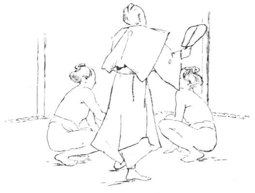 At the Tatsumi-ya, just by the remains of the huge bronze torii, which, until it was blown down by a hurricane, formed the entrance to the main street, I found a little suite of rooms built in the garden away from the rest of the house, and at once engaged them, in happy anticipation of quiet{22} nights. These isolated rooms have some disadvantages, such as having to get to the bath and back on wet nights, but a very short acquaintance with life in a tea-house makes the traveller disregard such trifling inconveniences for the certainty of peaceful sleep. The Japanese wanderers usually finish their day’s journey about five in the afternoon, and, after the preliminary cup of tea, discard their travel-stained clothes for the clean kimono which every well-regulated tea-house supplies to its guests, then bathe in water as near the boiling-point as possible, eat their dinner, sit talking and smoking till midnight, snore till five o’clock in the morning, when the clatter of taking down shutters begins, and the elaborate business of tooth-cleaning and tongue-scraping, with an accompaniment of complex noises suggesting seasickness in its worst stages, so it is not till they have departed at six or seven o’clock that a light sleeper gets much chance. In the daytime the tea-house is deserted, except by the proprietor, who sits in the front room and does his accounts, and by the little servant-girls, who, with their heads tied up in towels, kimono tucked into their obi, and sleeves fastened back, showing a good deal of round brown leg and arm, busily sweep and dust the rooms in preparation for the new set of visitors who will arrive in the evening. The thin sliding partitions would be little bar to sound even if they reached to the top of the room, and above them there is generally a foot or so of open wood-work, which allows free ventilation and conversation between the different apartments. Privacy, as we understand it, is no part of the scheme of a Japanese tea-house. Real fresh air from outside is very difficult to get at night. During the hot weather I was always careful to examine the fastenings of the wooden shutters with which, after dark, every house is enclosed like a box, so that I could surreptitiously open a crack opposite my room, although by so doing I was disobeying the{23}