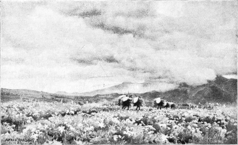 The park at Nara is one of the few places in Japan where you can see real turf, and even there I was struck by the scarcity of ground flowers; there were plenty of scentless{16} violets, some yellow and white dandelions, and in the damp ditches a little purple flower called jirobo by the country people, but there was nothing to compare with the masses of daisies, buttercups, and cowslips which make the English meadows so bright in the spring. Perhaps the mountain moorlands would have been as gay at that time as I found them later in the year; the fields are far too well cultivated for any weed to get a chance of flowering.