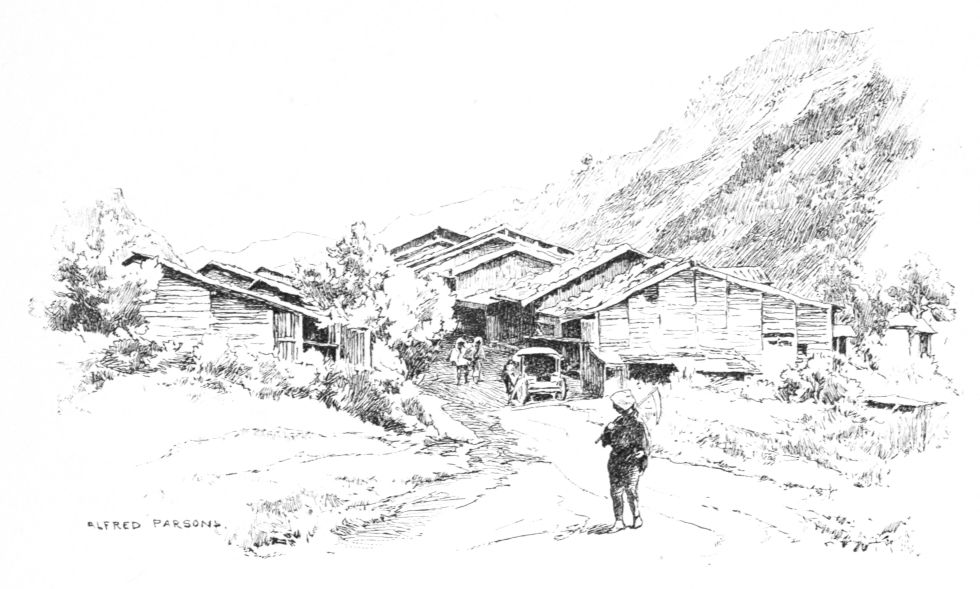 On the 25th of April the cherry-trees were in full flower, and I left Nara for Yoshino, a village at the foot of Mount Omine, in Yamato, which has for centuries been noted for its cherry groves. Here the cult of the cherry blossom has its headquarters, and during the ten days or so which the blossoms last the little town is crowded with visitors. I was too late to see the place in its full glory; it stands at some height above the sea, and I consequently imagined that the flowers would be later than those at Nara, but the cherry which grows there in such quantities is an early species, and three days of wind and rain had covered the ground with pink petals and left very few of them on the trees in the celebrated groves. Fortunately there were still some flowery trees to be found in gardens and sheltered corners, and at this time of year it would be impossible to settle down in a Japanese village without finding plenty of subjects to paint. The cherry in the Yoshino groves has a single flower, pale pink in color; this is followed by another{19}