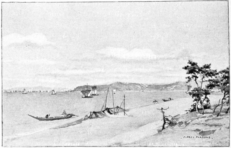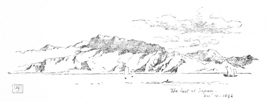 fields, and always in the distance the ranges of snow-covered mountains in Kiushiu and Shikoku, the islands which enclose this lovely sea on the south. I longed to land and begin work at once, with a nervous dread in my heart that I should find nothing so good elsewhere, and, indeed, though there is plenty of material to be found everywhere{5} in Japan, I saw nothing finer than these islands of the Inland Sea; to cruise about among them in a comfortable boat would be an ideal way to spend a summer, and would probably not be devoid of adventure, for our captain told me many tales of treacherous currents and sudden squalls and sunken reefs.