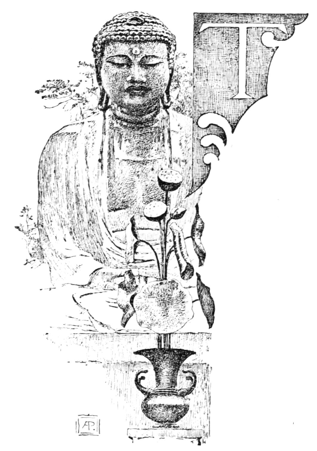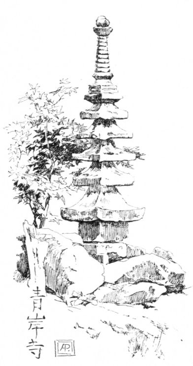 There were still some hours of daylight left after I had settled down in my quarters, so I wandered up the street and climbed the long flight of steps to the great temple of Kwannon. On each side of the steps small beds were built up, and in these the pæonies grew, and their big flowers, ranging in color from white to dark purple, glowed in the afternoon light against a background of gray stone lanterns. The temple is built on a hill-side, like Ni-gwatsu-dō at Nara and many other Buddhist temples, and it consists of a wide veranda filled with incense-burners and votive pictures and bronze lanterns, and of an inner sanctuary. Across the entrance to this stands an altar, and over it an opening in the dark purple curtains allows a glimpse of the great gold figure of Kwannon, nearly thirty feet high, her face, with its expression of calm beneficence, only just distinguishable by the light of a few dim lamps in the gloom of the window{34}less shrine. Behind this main temple there are various other buildings, priests’ houses and such like, and a little pond for the sacred tortoises.