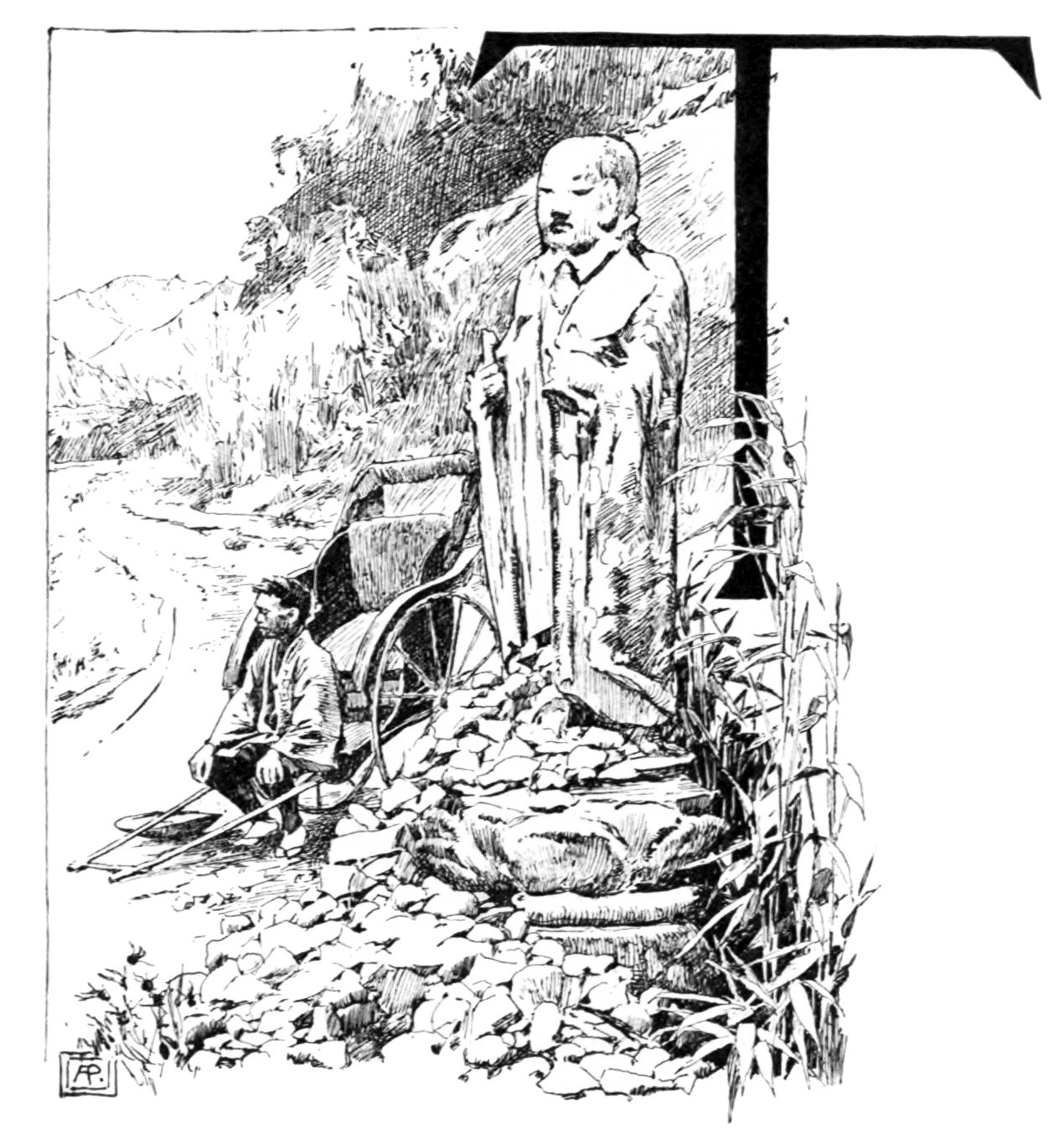 On the 3d of May my host at the Ta-tsumiya brought me some pæony flowers arranged in an old bronze vase. This showed me it was time to move on to Hase, where there is a great display of them, so next morning I made an early start for a long jinricksha ride through the hills of Yamato. My baggage and painting materials could not be packed in less than two kuruma, two more were necessary for my boy and myself, and the four vehicles, with two men drawing each, made an imposing procession as we bumped down the steep village street. The whole staff of the Tatsumi-ya had turned out to say good-bye; there was a row of little girls kneeling on the floor, their noses on the matting and their brown hands placed flat, palms downward, in front of their heads, and the landlord, after giving me the usual presents and a receipt for my “chadai”—the part{30}ing tip—insisted on accompanying me to the end of the town.