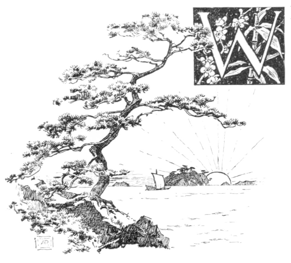 The earlier cherry-trees were in blossom by this time, and I lingered on, making studies of them, and learning Japanese words and ways from O Nao San, a young lady about twelve years old, who had appointed herself my special attendant and protector at the Kiku-sui Hotel. One night at the theatre I saw a modern farce, with a policeman, an old-fashioned Japanese gentleman, a Chinaman, and an Englishman as the comic characters. They were ridiculous and amusing, but when all the earlier incidents of the piece were narrated with conscientious realism in evidence before a magistrate the thing became monotonous, and struck me as faulty in dramatic construction. This was the only theatre I saw in Japan in which they had discarded the orchestra and chorus and other traditions of the old stage.