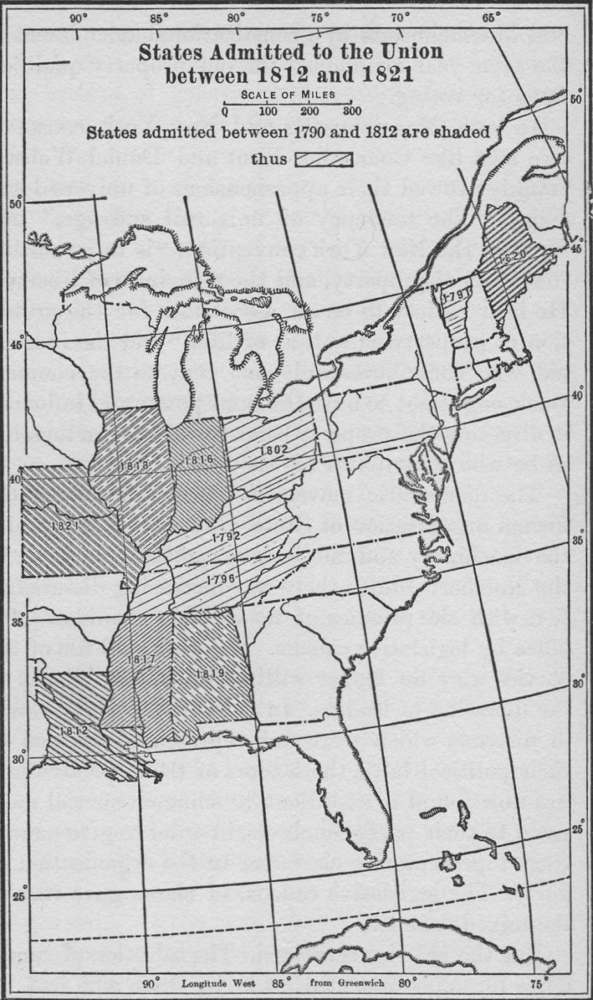 The title of this volume must be regarded as suggestive rather than as strictly accurate, for the beginnings of union are to be found farther back than 1783, and democracy in its largest sense has even yet been only imperfectly realized. At the close of the Revolution, union was but a name. What Metternich said of the Italy of his day might have been said of the United States in 1783: it was only a geographical expression. The formation of the new federal union under the Constitution is properly the main, though not the sole, theme of this volume. Behind the thirteen Atlantic communities lay a vast region which almost at once invited the colonizing activities of the people. The rise of this western world is a movement of immense significance. Out of the bosom of the West emerged the new democracy which transformed the face of society in the old States. Whether viewed economically or politically, this forms the second theme in any history of the times. Around these two movements, therefore, I have endeavored to group the events of forty-five years.