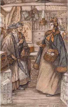 She stood waiting in the shop while Dimbleby thoughtfully weighed out some sugar for her; a stout woman with a round good-natured face, framed in a purple-velvet bonnet and nodding flowers; her long mantle matched the bonnet in stylishness, and was richly trimmed with imitation fur, but the large strong basket on her arm, already partly full of parcels, was quite out of keeping with this splendid attire. The two women who stood near, listening with eager respect to her remarks, were of very different appearance; their poor thin shawls were put on without any regard for fashion, and their straight cotton dresses were short enough to show their clumsy boots, splashed with mud from the miry country lanes. The edge of Mrs Greenways’ gown was also draggled and dirty, for she had not found it easy to hold it up and carry a large basket at the same time.