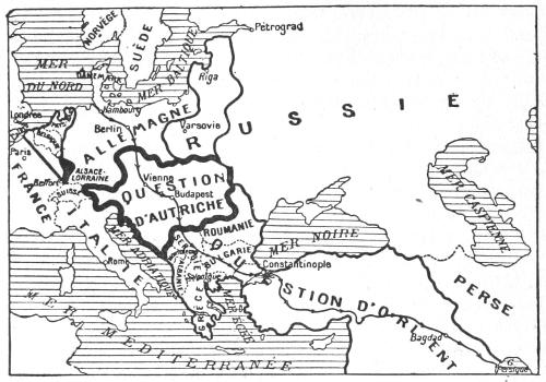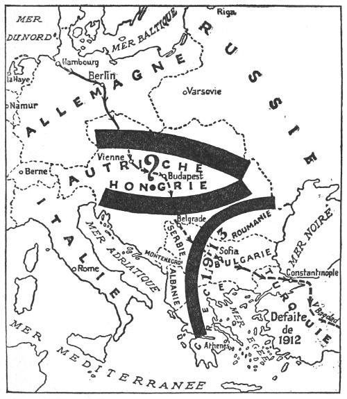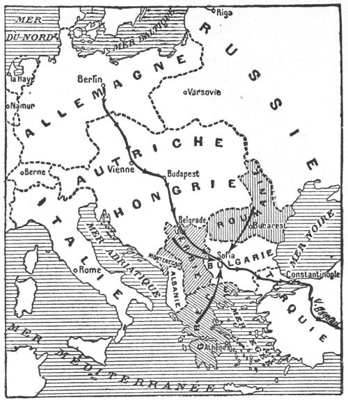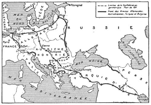 That this project has for a long while past been in course of preparation by the Kaiser and his megalomaniac advisers cannot for a moment be doubted. When, in November, 1898, William II. pronounced his famous speech at Damascus, in which he stated that all the three hundred millions of Mohammedans in the world could rely upon him as their true friend, the world was inclined to regard the utterance as mere rhodomontade. It was nothing of the sort. It involved the declaration of a definite and far-reaching policy, the execution of which was delayed until a favourable moment occurred and, notably, until the Kiel Canal was completed. The whole conspiracy very nearly succeeded. In spite of their careful attention to detail, their talent for organization, and their elaborate preparations to meet what appears to them every contingency which may occur, the Germans seem to have a constitutional inability to grasp the motives which guide the inhabitants of[xvi] other countries. A very close analogy to the mistake made by the Kaiser is to be found in an incident of recent English history. It is alleged, I know not with what truth, that when, in 1886, Lord Randolph Churchill resigned his position as Chancellor of the Exchequer in Lord Salisbury’s administration, he “forgot Goschen,” who, as it will be remembered, was speedily nominated to succeed him. The Kaiser forgot England. For various reasons, which are too well-known to require repetition, he and his advisers were firmly convinced that England would not join in the war. The programme was, first, to destroy the power of France and Russia, and then, after that had been done, to fall upon England. In one sense it was fortunate that the Germans committed the gross international crime of invading Belgium. Had they not done so, it is quite possible that the English nation would not have woke up to the realities of the situation. As it was, however, it became clear, even to the most extreme pacificists, that honour and interest alike pointed to the necessity of decisive action. Thus as M. Chéradame indicates, the original German plan was completely upset. The advance on Paris had to be stayed. But the programme, which was the result of long and deliberate contemplation, has by no means been abandoned. On the contrary, with the adhesion of the Bulgarians, who will eventually, unless the Allies secure a decisive victory, become the victims of Pan-Germanism, and also that of the Turks, who were manœuvred into the war by an adroit and absolutely unscrupulous diplomacy, a very considerable portion of the plan has already been put into execution.