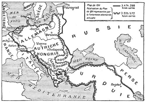 The accompanying map exhibits this incontestable truth in a graphic form by showing the outlines of the actual German fortress compared with the[217] outlines contemplated by the 1911 plan. According to it the German conquests were to have extended to 3,474,288 square kilometres, in addition to Germany itself. But these conquests and seizures at the beginning of 1916 were accomplished over an area of 3,035,572 square kilometres. This geographical proof is confirmed by many manifestoes which have appeared on the other side of the Rhine advocating a policy of annexation. Amongst these may particularly be noted:—
