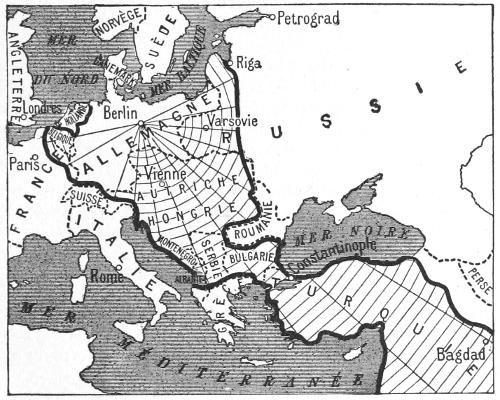 Now it is certain that if Germany were to give up her gains in the East and the West, while maintaining her seizures in the South and South-East, her power would at that moment be formidably increased as compared with what it was before the[223] war. That, therefore, would be an indisputable and enormous victory for Pangermanism. The sketch map, inserted below, represents this truth in a graphic form. From Berlin radiate the lines on which are stretched the threads of that immense spider’s web which covers the whole of the enormous Pangerman gains achieved by Germany in the course of the war. These gains she has been able to effect by means of