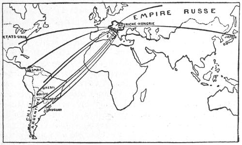 The second map shows the group of States in Asia and America which, menaced by the world-wide consequences of the “Hamburg to the Persian Gulf” scheme, have also a high and direct interest in the solution of the Austro-Hungarian question. Japan is already helping the Allies notably, but her assistance might be still ampler, more effective and more direct. The strictest view of her interest should compel her to enlarge the scope of her succour, since nothing but the total defeat of Germany in Europe can prevent Japan from witnessing a long series of disturbances fomented at her expense in the Chinese Empire (see p. 98). As I have already shown (p. 105) many States in South America are directly aimed at by the Pangerman[234] plan of 1911. But that plan can never be really formidable for these States, unless Germany should one day have at her disposal the powerful resources which would accrue to her from the accomplishment of the scheme “from Hamburg to the Persian Gulf.” Chili, Argentina, Uruguay, Paraguay, Bolivia, Colombia, Brazil, have all been the object of preparatory Pangerman manœuvres. That warning ought to convince them without delay that they have an undoubted interest in co-operating, to some extent, in the common cause. They could do so, particularly Argentina and Brazil, to good purpose in the economic sphere.