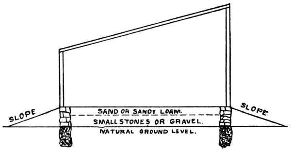 Select a dry location; if the ground is not naturally dry make it so by draining it. The first illustration gives a plan for making the interior of a poultry house absolutely dry, if the ground is fairly well drained. The foundation walls are built up about eighteen inches above the ground level; about twelve inches of this space is filled in with small stones or coarse gravel, and the balance with fine sand or dry, sandy loam; on the outside the ground is sloped up to the level of the bottom of the sills, and thus all surface water is effectually turned away.