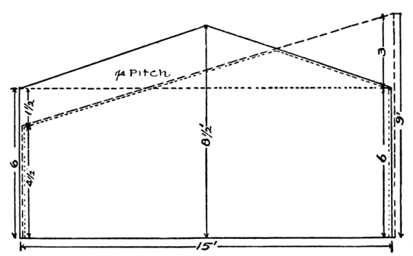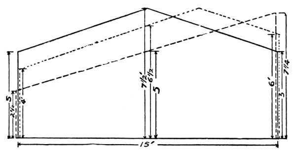 The shape of the roof of a poultry house greatly influences the cost, and, generally speaking, the preference should be for houses with single-span (or “shed”) roofs. See Figs. 2 and 3. These houses are the easiest and cheapest to build, they give the much-desired vertical front, with room for the windows to be placed high to distribute the winter sunshine (Fig. 4), and with the drip of the roof all carried off [Pg 6] to the north the ground in front of the house is dry. It also is cooler in summer, as it is not exposed to the direct rays of the sun, and is warmer in winter because it gets the direct rays of the sun.