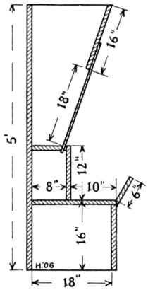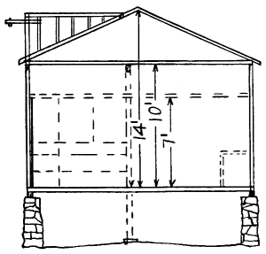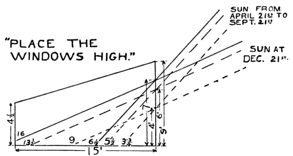Sunlight is a necessity to fowls; it carries warmth and good cheer, and tends to arrest or prevent disease. Too much glass makes a house too cold at night and too warm in the daytime, because glass gives off heat at night as readily as it collects it in the daytime. Much glass makes construction expensive; allow one square foot glass surface to about sixteen square feet floor space, if the windows are properly placed. The windows should be high, and placed up and down, not horizontally and low (Fig. 4). In the former the sunlight passes over the entire floor during the day, from west to east, drying and purifying practically the whole interior. The time sunshine is most needed is when the sun is lowest, from September 21 to March 21. The lines in Fig. 4 represent the extreme points which the sunshine reaches during this period, with the top of a four-foot window placed four feet, six feet, and seven feet high, respectively. With the highest point of the window at four feet, the direct sun’s rays would never reach farther back than nine feet; at six feet it would shine thirteen and one-half feet back, and at seven feet it would strike the back side of the house one foot above the floor.